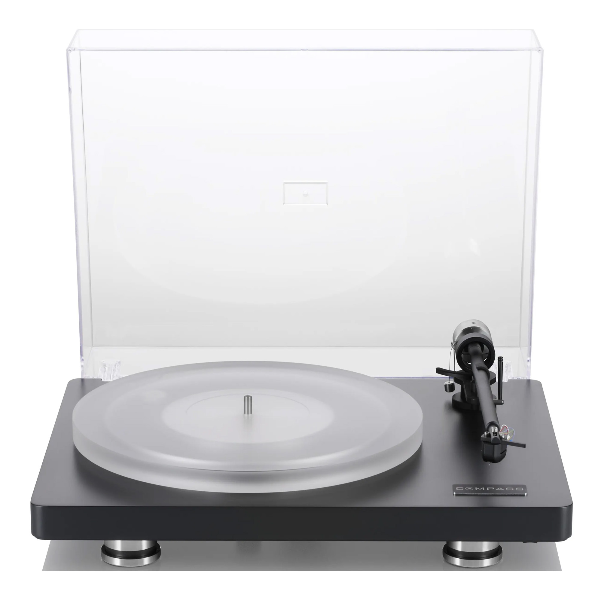 Clearaudio Compass впечатляет не только своим звучанием, но и четким дизайном. Она доступна в черном или серебристом исполнении и сочетает в себе утонченную элегантность и техническую изощренность. Прочная стальная пластина на нижней стороне корпуса обеспечивает стабильность и поддерживает низкие резонансные характеристики. Высококачественный акриловый пылезащитный чехол с петлями из нержавеющей стали защищает поворотный стол, не нарушая его дизайна.