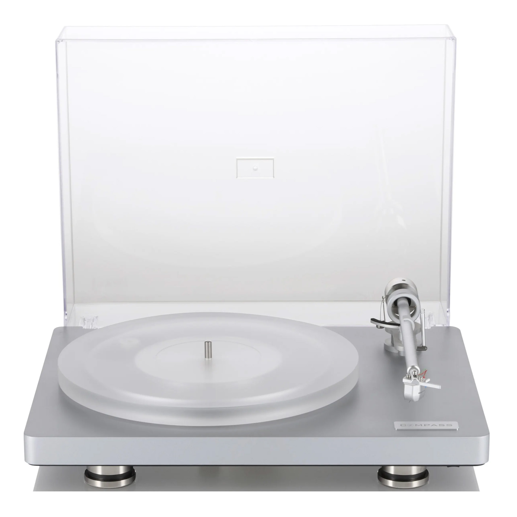 Clearaudio Compass впечатляет не только своим звучанием, но и четким дизайном. Она доступна в черном или серебристом исполнении и сочетает в себе утонченную элегантность и техническую изощренность. Прочная стальная пластина на нижней стороне корпуса обеспечивает стабильность и поддерживает низкие резонансные характеристики. Высококачественный акриловый пылезащитный чехол с петлями из нержавеющей стали защищает поворотный стол, не нарушая его дизайна.