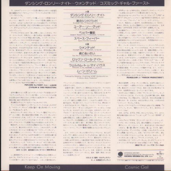 Пластинка Keep On Moving - это яркий образец диско-электроники конца 1970-х, где космические мотивы и светлый грув соединяются в одно цельное, чарующее настроение. Выпущенная в Японии в 1979 году лейблом Overseas Records (каталожный номер SUX-166-V) пластинка мгновенно погружает в атмосферу клубных огней, неонового света и большого танцпола под звёздным небом.