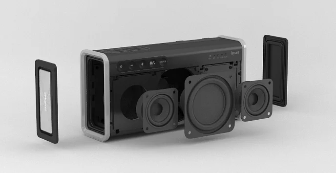 В большинстве портативных динамиков для воспроизведения всего звукового спектра используется только один усилитель. В конструкциях с одним усилителем большая часть мощности расходуется на воспроизведение низких и средних частот, передача же высоких частот при этом страдает. В отличие от таких конструкций, в модели iRoar Go используется два усилителя: один выделен для средних и низких частот, а второй — для высоких. Это позволяет динамику обеспечивать безукоризненно чистое, высококачественное, хорошо сбалансированное звучание при воспроизведении музыки. Направленный вверх низко- и среднечастотный излучатель расположен горизонтально, что понижает центр тяжести динамика, обеспечивая большую стабильность конструкции.