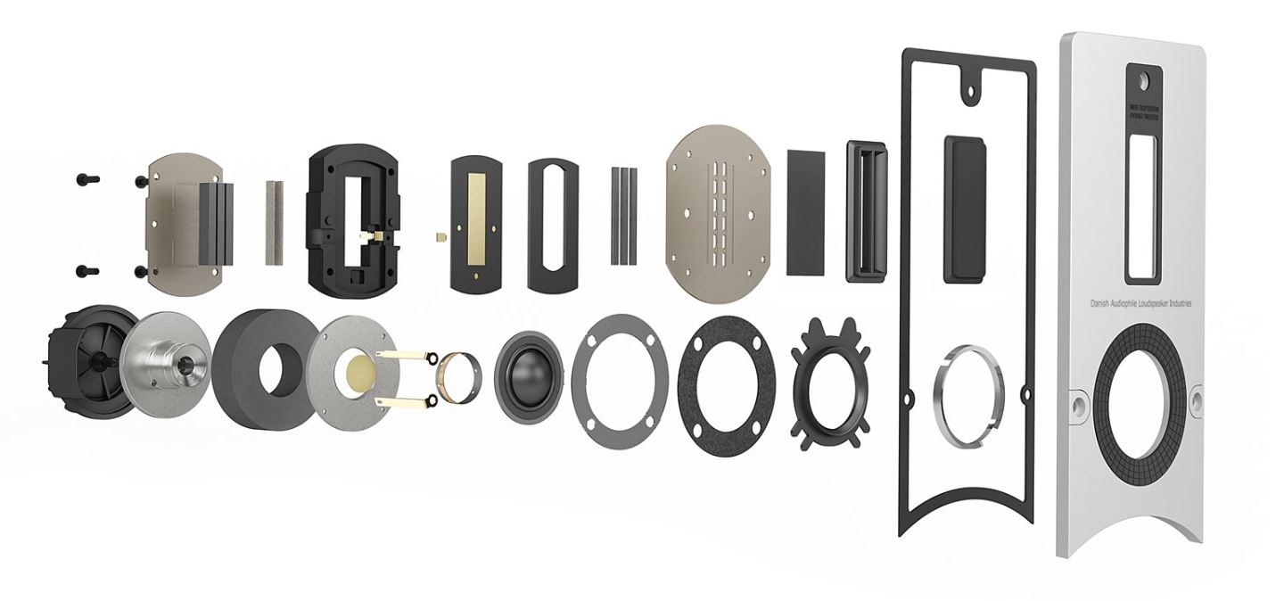 Гибридный модуль твитера в составе DALI Epicon Vokal оснащен новым купольным твитером, специально разработанным для серии Epicon. И ленточный, и купольный твитер размещены на отдельной, массивной литой алюминиевой пластине, в отдельных изолированных отсеках, чтобы исключить влияние резонансов.