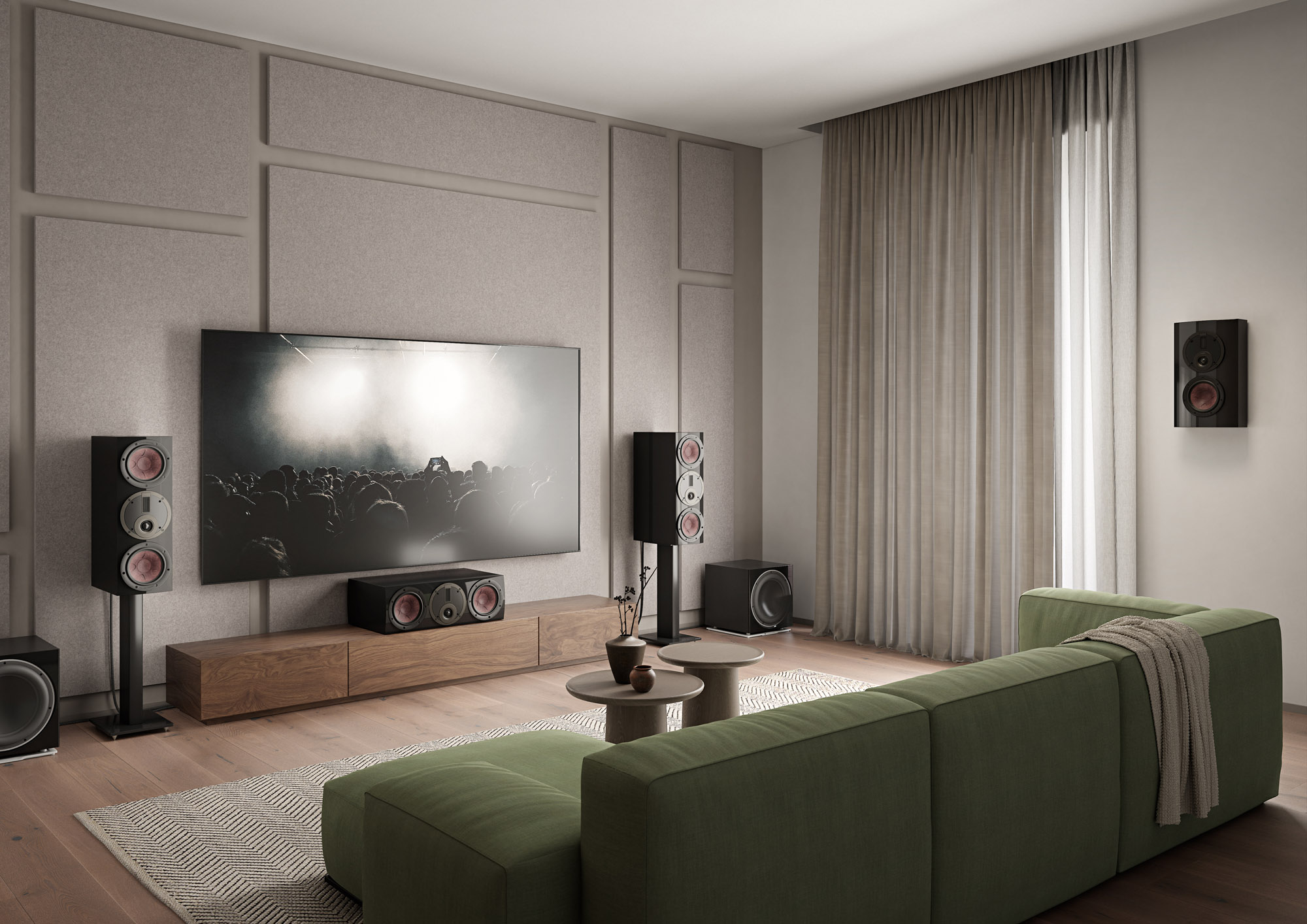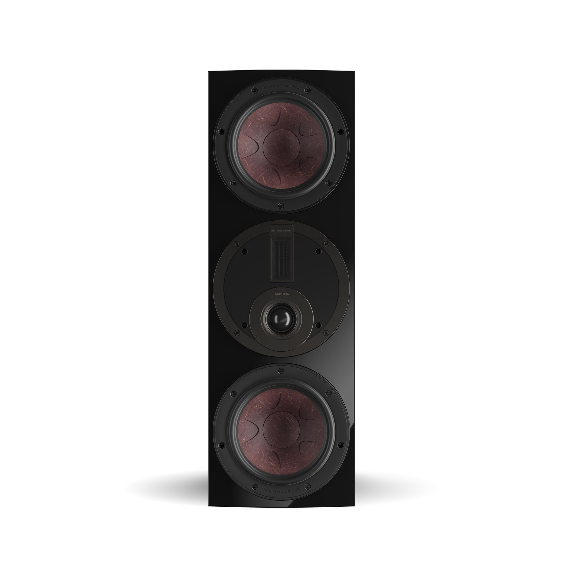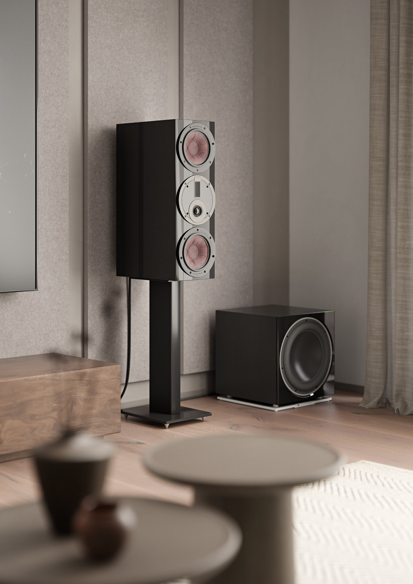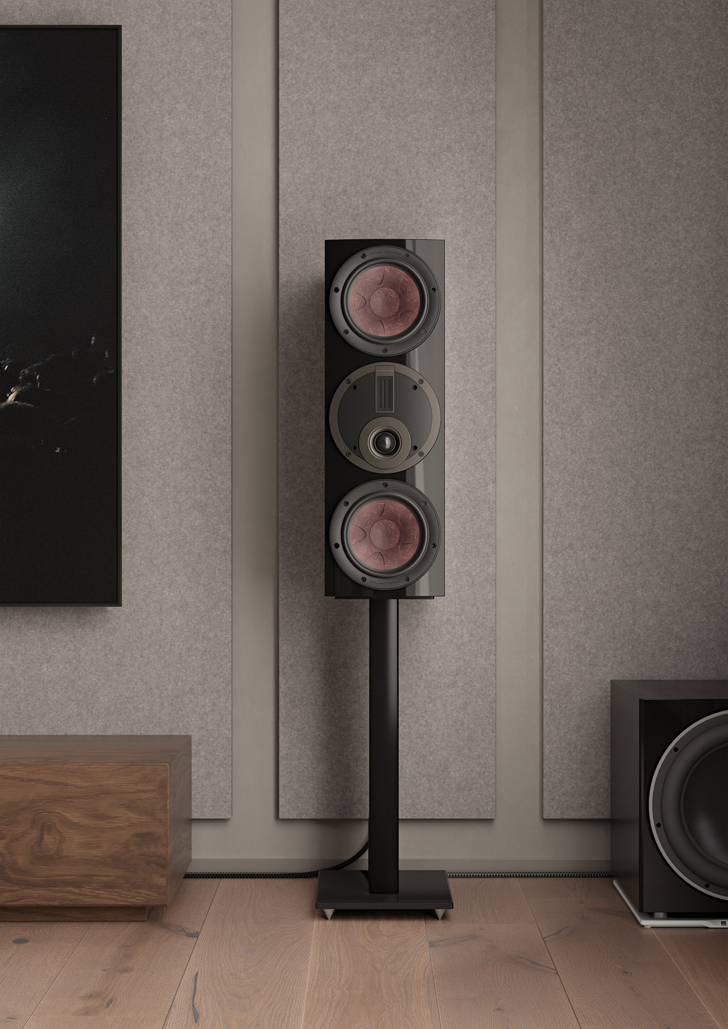 Поворотная конструкция ВЧ блока позволяет установить Rubikore Cinema как горизонтальный центральный канал или вертикально в качестве полочной акустики. При установке вертикально, для лучшей согласованности с помещением и более эффективной механической развязки от поверхности, акустику можно установить на специальных стойках с опорными шипами на верхней панели.