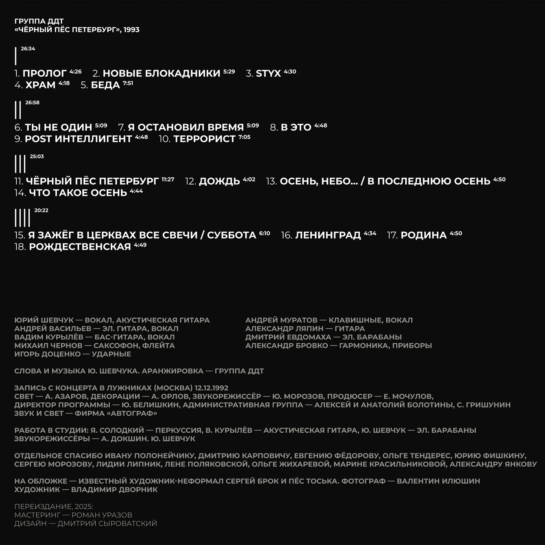 «Чёрный Пёс Петербург» - культовый двойной виниловый альбом ДДТ, увидевший свет в 1992 году и ставший важнейшей вехой в истории группы. Это первый официальный концертный релиз коллектива, включённый в номерную дискографию, и одновременно мощный художественный манифест эпохи. В основу пластинки легла первая масштабная концептуальная программа ДДТ: двенадцать новых на тот момент песен, которые ранее не издавались официально и звучали как откровенный диалог со временем, городом и человеком. Живой звук, насыщенная атмосфера петербургских концертов начала 90-х и эмоциональная подача Юрия Шевчука превращают альбом в цельное драматургическое полотно. Дополняют программу проверенные хиты с альбома «Актриса Весна», благодаря чему «Чёрный Пёс Петербург» объединяет эксперимент, философию и узнаваемую лирику группы. Пластинка выпущена ограниченным тиражом всего 1000 экземпляров и представлена в двух коллекционных вариантах: чёрный винил в белом конверте или белый винил в чёрном конверте (по 500 копий каждого). Настоящая находка для поклонников русского рока и ценителей редких изданий.