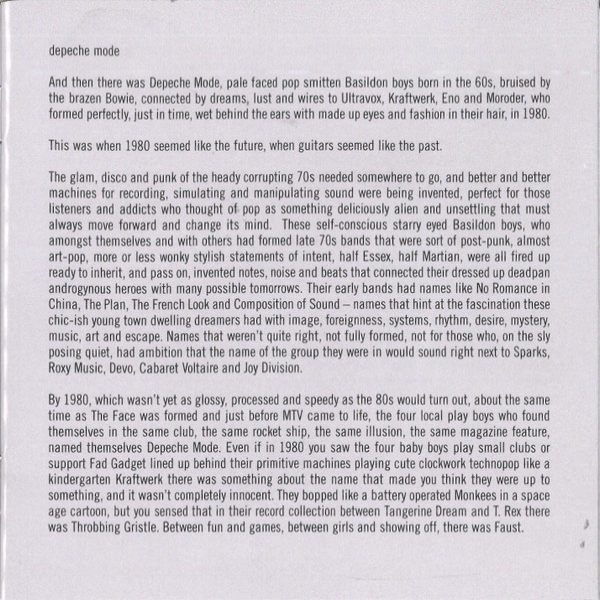 Эта антология собирает культовые треки, ставшие гимнами для нескольких поколений: провокационный “Personal Jesus”, гипнотический “Enjoy The Silence”, дерзкий “Strangelove”, драматичное “Never Let Me Down Again” и десятки других. Каждый трек ремесленно отполирован лучшими продюсерами эпохи - Flood, Mark Bell, Ben Hillier, Tim Simenon - что делает коллекцию не просто подборкой, а выверенным портретом музыкального пути Depeche Mode.