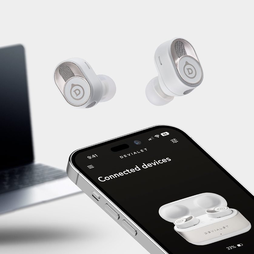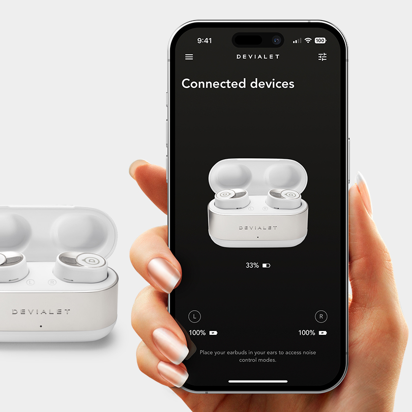 Усовершенствованная технология Devialet Adaptive Noise Cancellation™ динамически подстраивается под форму вашего уха. Каков результат? Уменьшение звуковых артефактов и белого шума, более приятное прослушивание без ущерба для производительности и увеличенное время автономной работы.