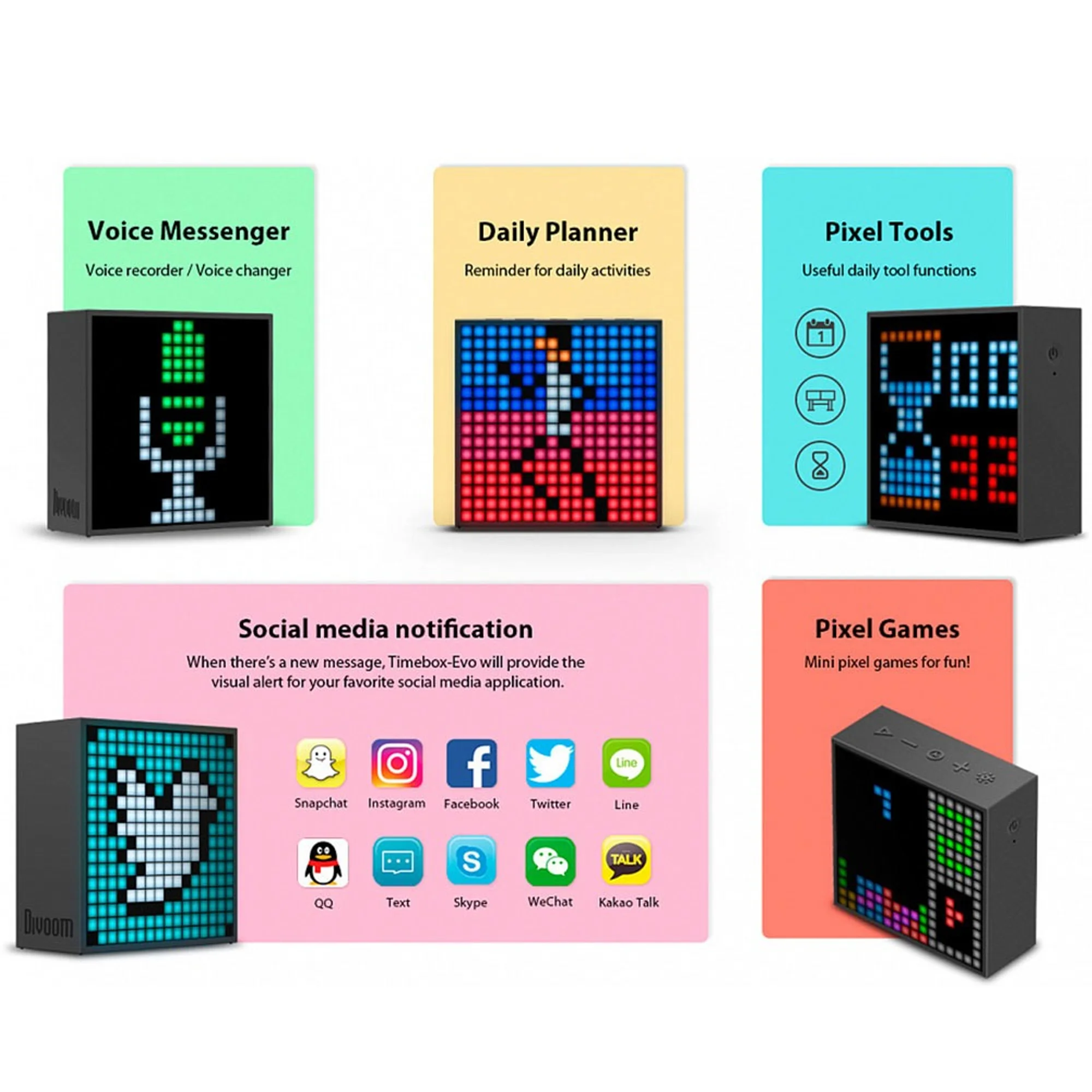 Уведомления: Timebox-Evo может отображать уведомления из социальных сетей и других приложений в виде пиксельных иконок.