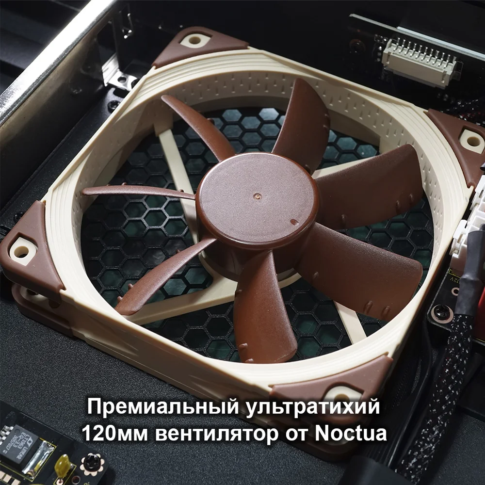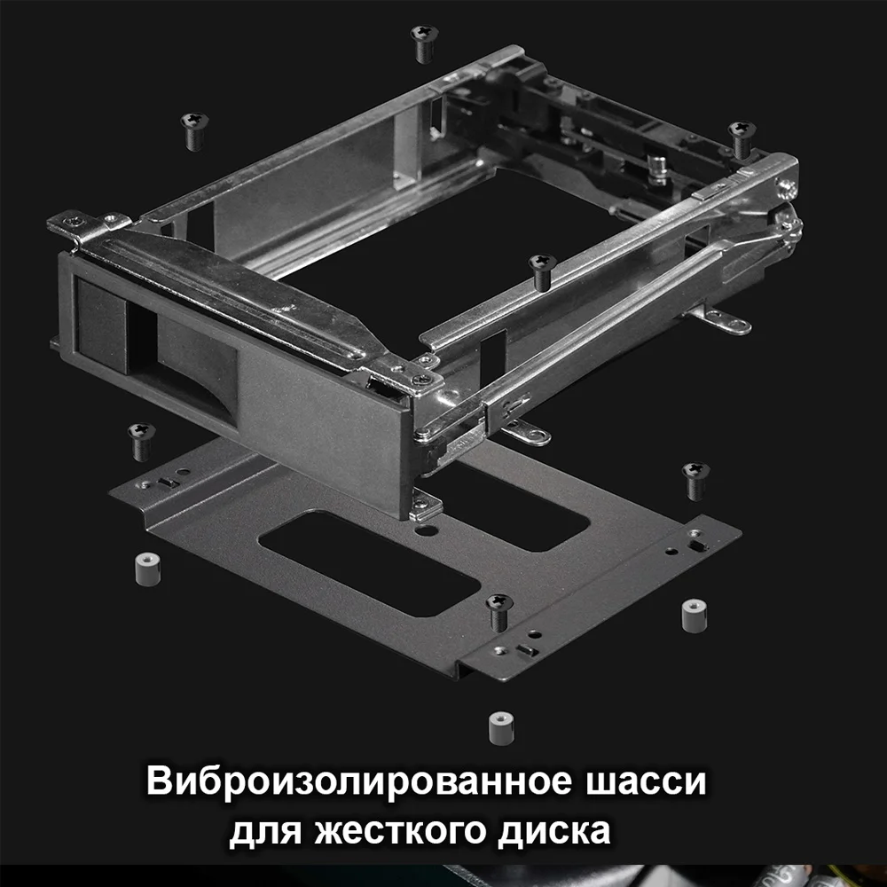 Полноразмерный корпус со стильной брашированной алюминиевой передней панелью. Два виброизолированных отсека для 3.5" SATA жестких дисков с поддержкой горячей замены обеспечивают удобный фронтальный доступ. Дисковые отсеки и передний порт USB 3.0 аккуратно скрыты за элегантными дверцами.