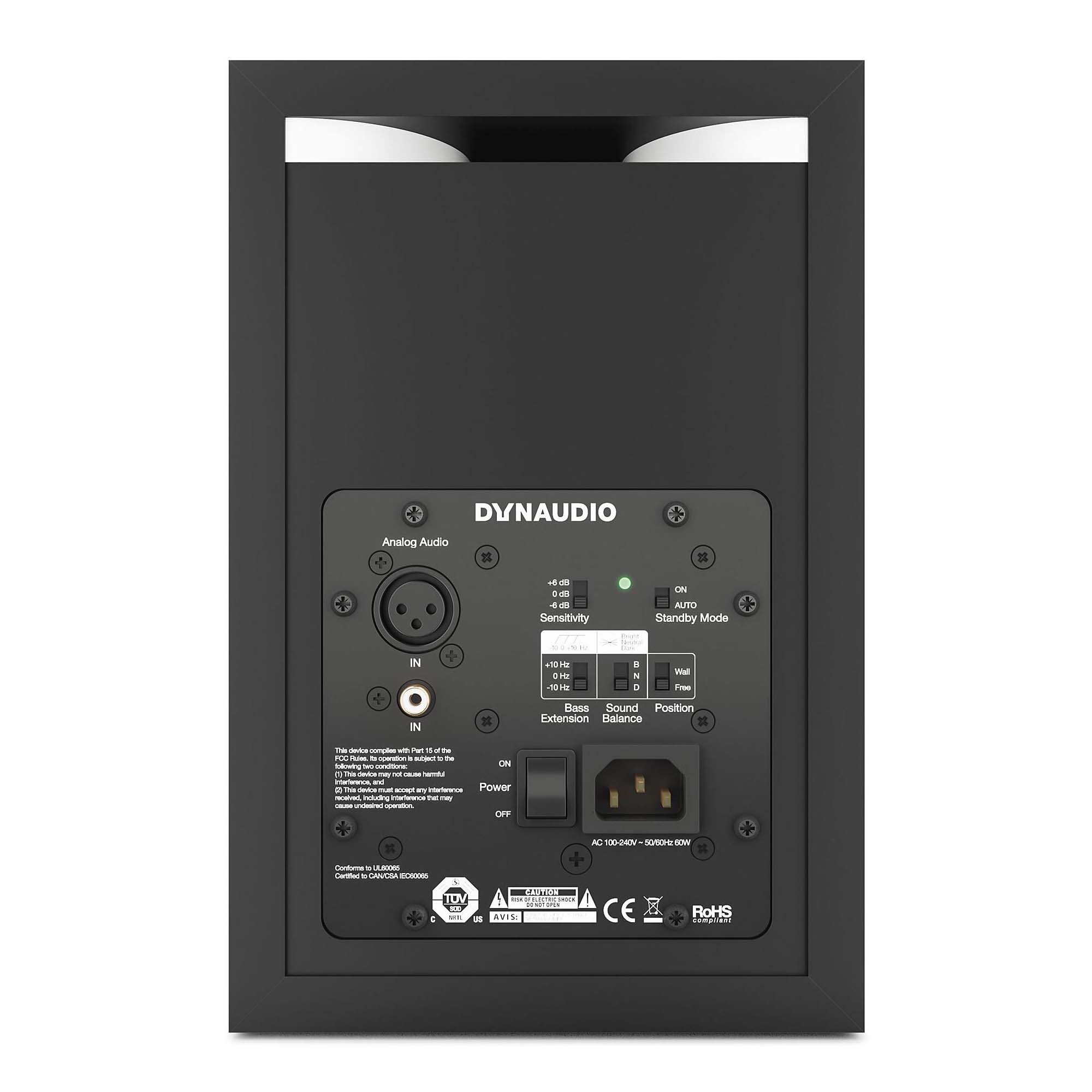 На тыловой панели Dynaudio LYD 5 можно найти аналоговый балансный вход на XLR, небалансный вход на RCA для бытовых источников, а также несколько переключателей: позиции в помещении, басового обрезного фильтра, чувствительности на входах и баланса (три предустановленных режима фильтра), также есть переключатель Standby Mode, который управляет автоматическим отключением.