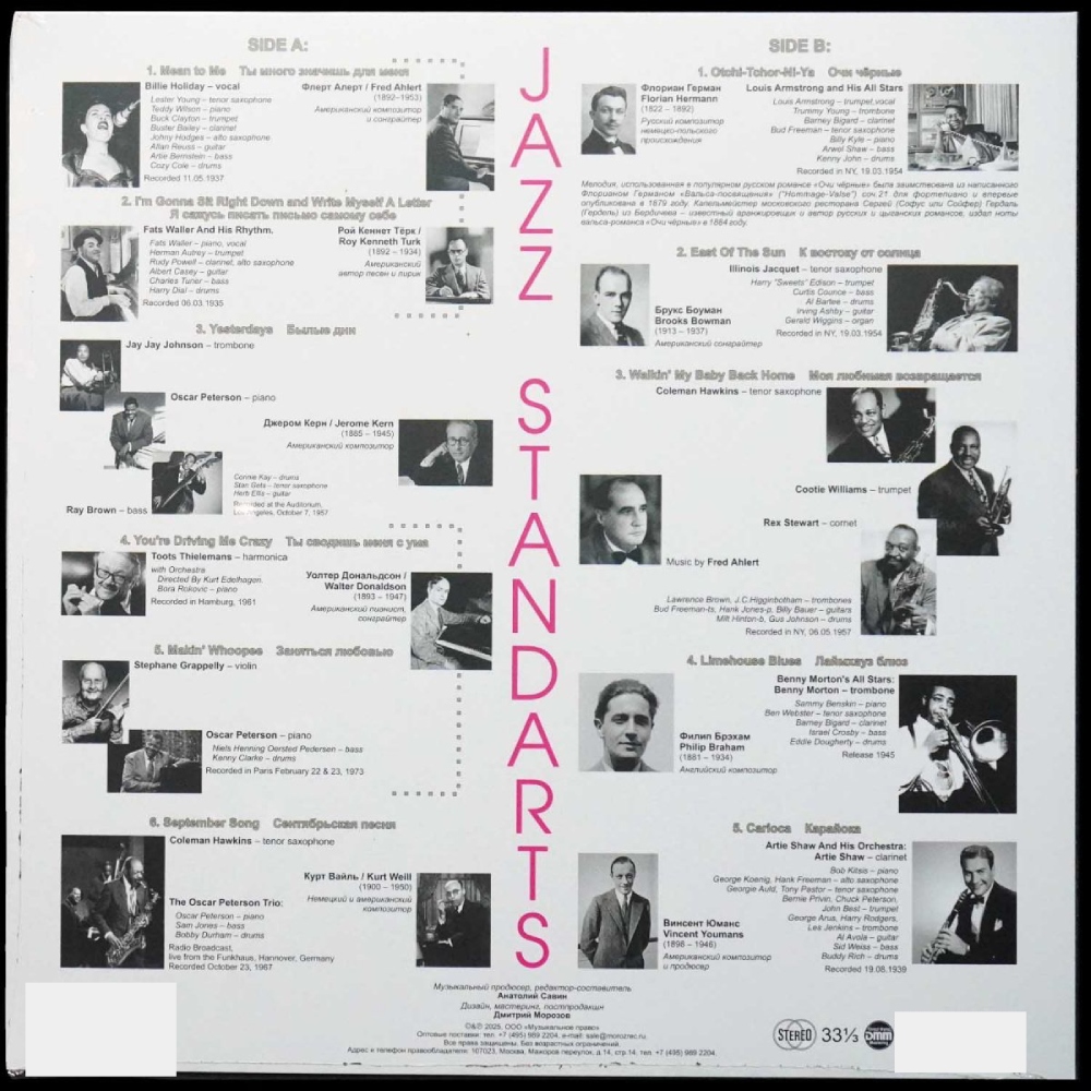 Виниловая пластинка Джазовые стандарты - Jazz Standards. Mean to Me это уникальная коллекция величайших мейнстрим‑интерпретаций джазовых стандартов, собранная с особым вниманием к историческим и художественным значениям произведений. Джазовые стандарты - это не просто популярные мелодии: это песни и инструментальные темы, которые за десятилетия стали неотъемлемой частью мировой музыкальной культуры. В данной подборке звучат классические записи, отражающие эволюцию жанра, от эмоционального вокала Билли Холидей до глубоких инструментальных интерпретаций мастеров саксофона и труба.