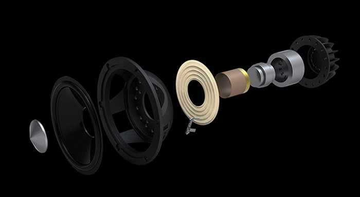 Между двумя большими неодимовыми магнитами помещается алюминиевая лента длинной 65 мм и толщиной 0,12 мм. Электрический ток, проходя через ленту, двигает ее, подобно катушке в обычном громкоговорителе. В то же время, лента также действует как диафрагма - перемещает воздух. Комбинация этих двух функций придает ленточному высокочастотному динамику высокую эффективность и отличную переходную характеристику без задержек.