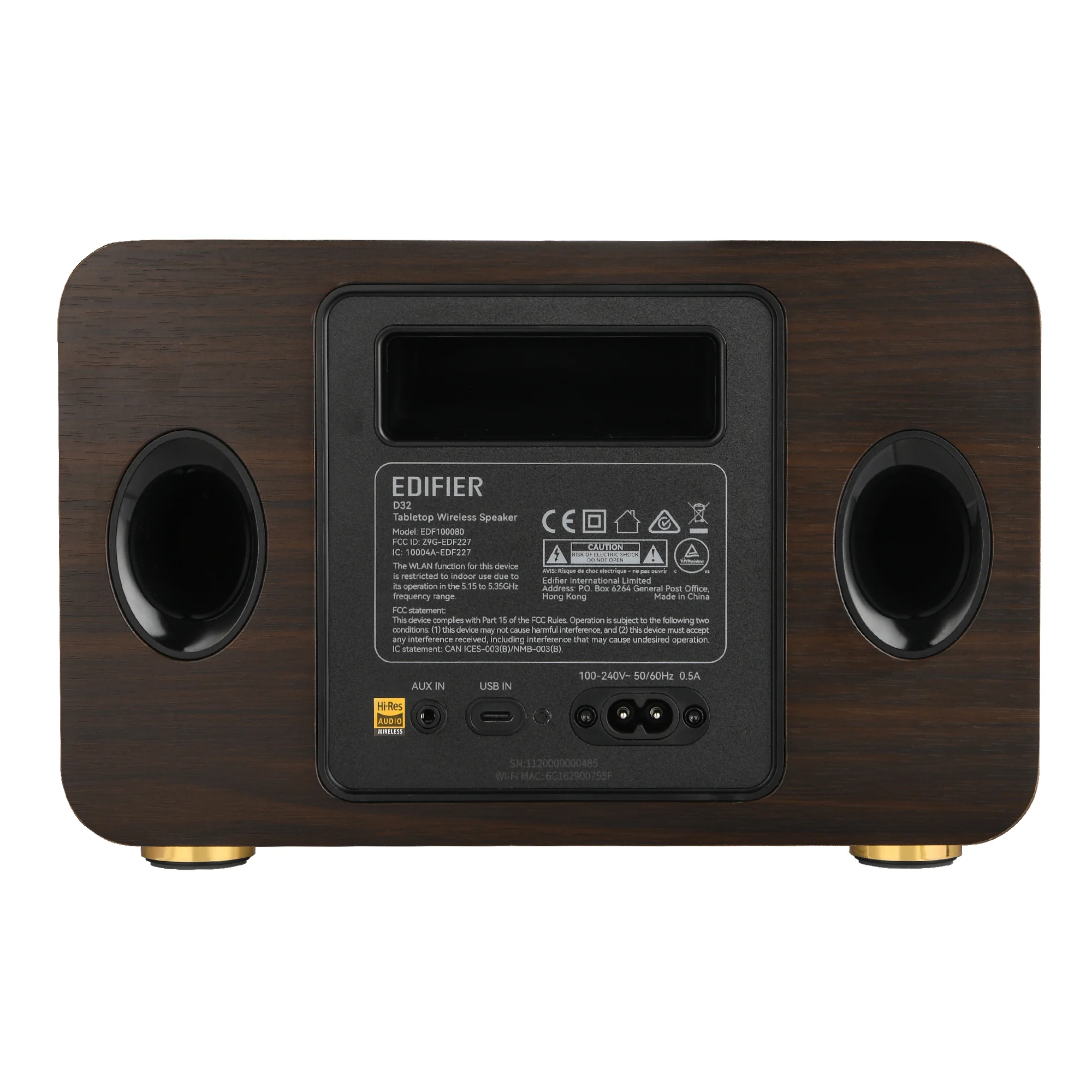 Колонка оснащена двухдиапазонным модулем Wi-Fi 5 ГГц и 2.4 ГГц. Благодаря поддержке Apple AirPlay2 вы можете транслировать на колонку музыку по Wi-Fi с устройств iOS, Apple TV и компьютера с установленной iTunes. Объедините одну или несколько колонок D32 в многокомнатную музыкальную систему и наслаждайтесь беспрепятственным прослушиванием музыки, блуждая по дому. Кроме AirPlay 2 при подключении к домашнему Wi-Fi реализована поддержка Spotify и Tidal Connect. Вернуться к аналоговым истокам можно за счет входа AUX 3.5 мм. Современная альтернатива — вход USB.