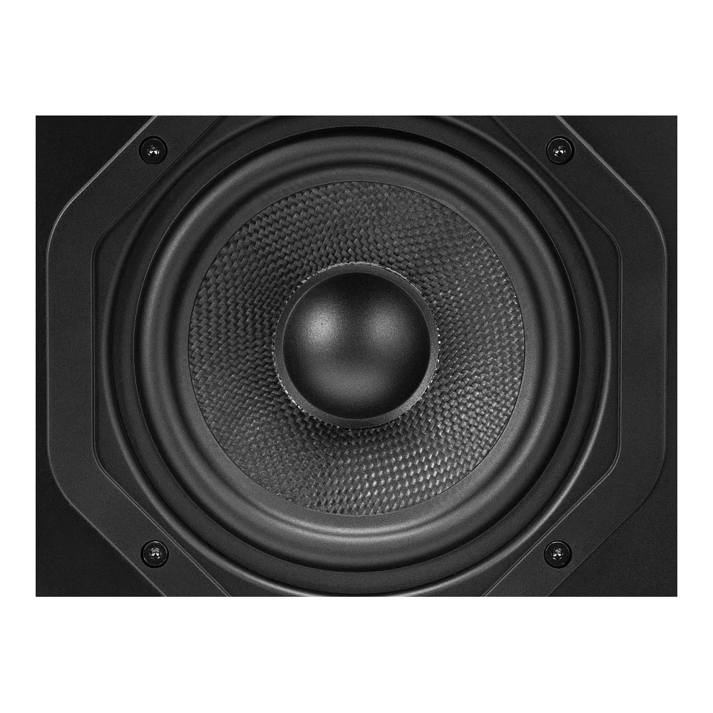 И, наконец, для обеспечения максимальной жесткости и устойчивости к паразитной вибрации, мастеровые корпуса сконструированы из толстого, надежно скрепленного, акустически инертного ДВП высокой плотности (HDF). При этом передняя панель изготовлена из цельной прочной плиты HDF толщиной 25мм. Плавная и ограненная 3D конструкция передней панели, заимствованная у студийных мониторов Emotiva, не только добавляет колонкам Airmotiv стильный футуристический вид, но и служит весьма практичной цели – минимизации дифракционных эффектов и уменьшению взаимодействий с окружающим помещением.