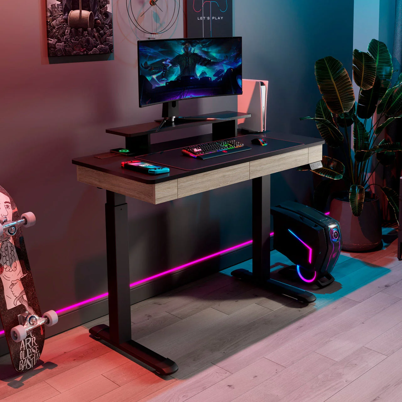 Столешница шириной в 120 см, рассчитана на размещение двух мониторов, игровой консоли, клавиатуры и различного дополнительного оборудования. Поверхность, повторяющая текстуру древесины дуба устойчива к царапинам, воде и загрязнениям.