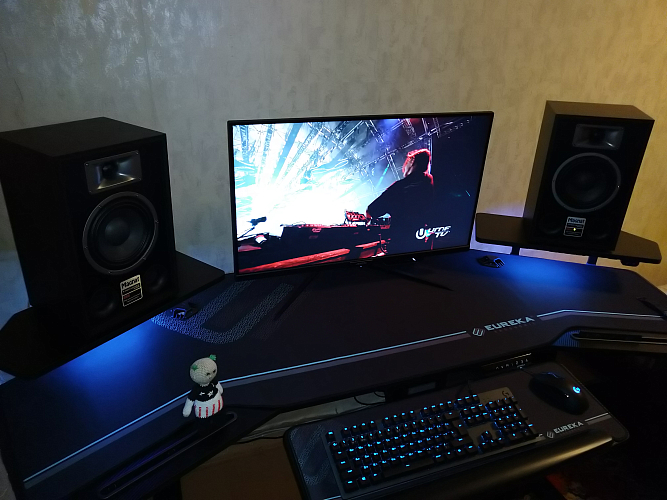 Под столом установлена подставка для клавиатуры с поворотным механизмом, позволяющим вращать её на 360 градусов. С дальней стороны столешницы — две полки с настраиваемой RGB-подсветкой, которые могут быть установлены в 3 разных положения: по центру, как подставки под мониторы, рядом с мониторами, например для колонок, или по бокам.
