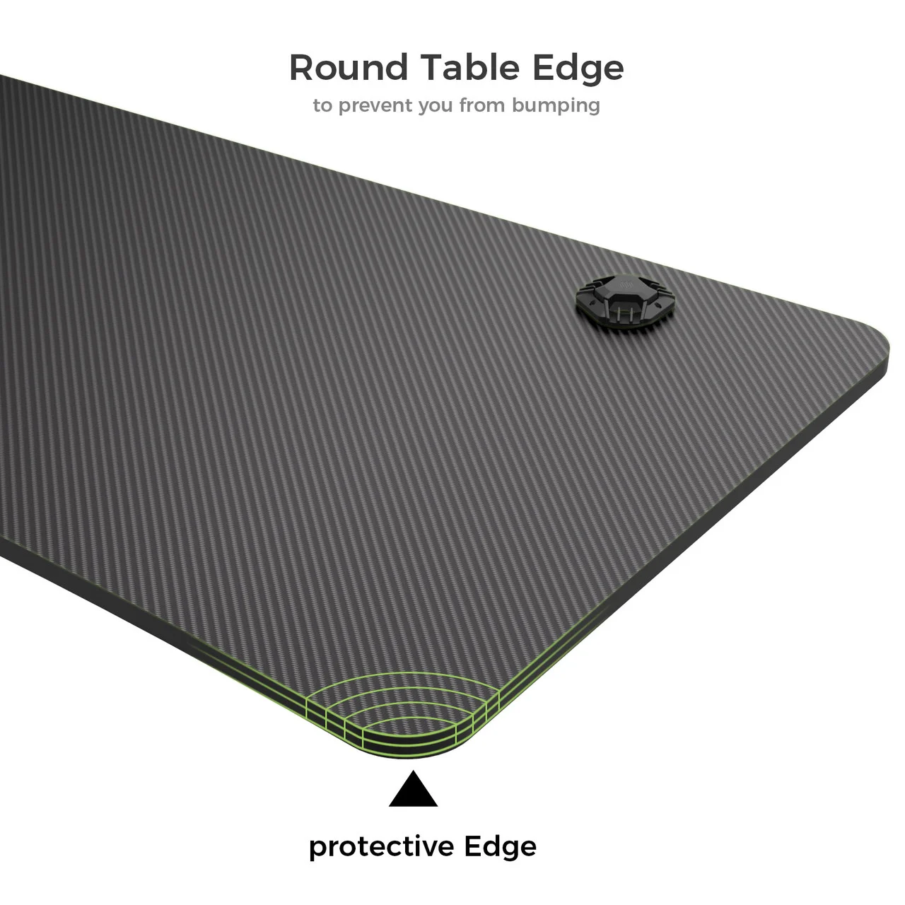 Столешница шириной в 148 см, рассчитана на размещение двух мониторов, игровой консоли, клавиатуры и различного дополнительного оборудования. Поверхность имеет текстуру углеродного волокна и устойчива к различным внешним воздействиям и загрязнению.