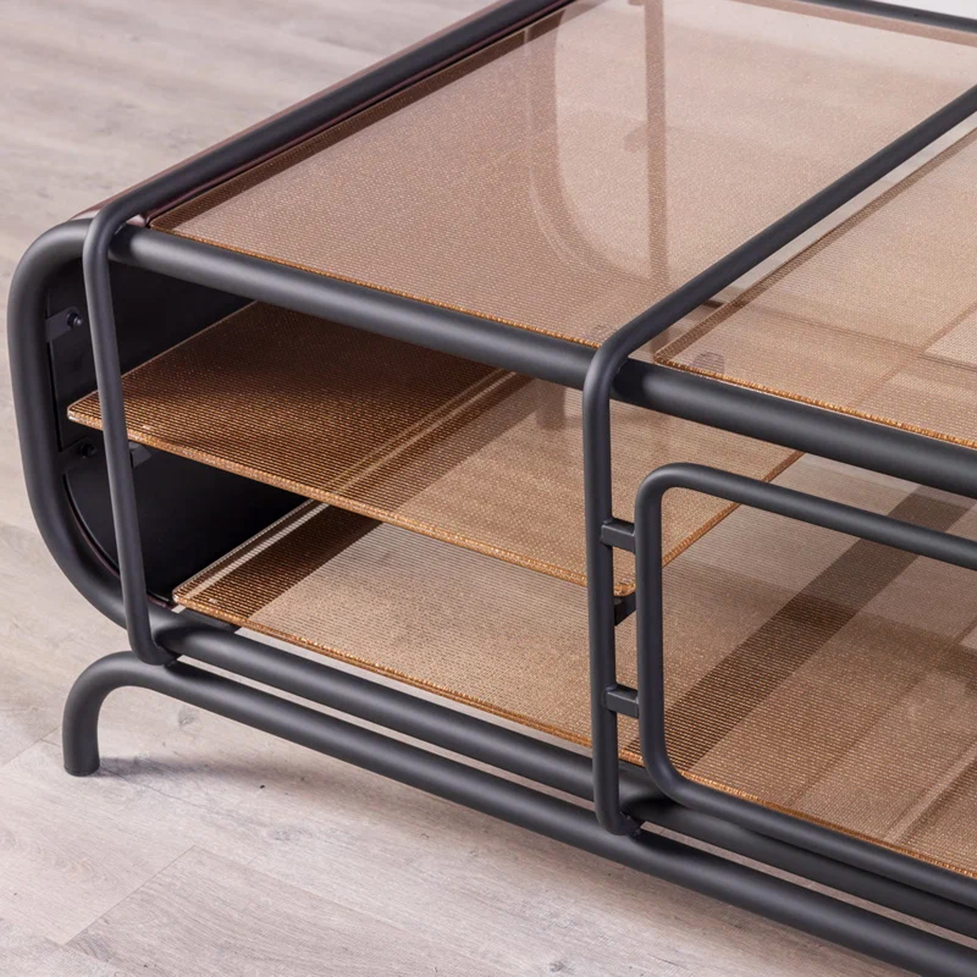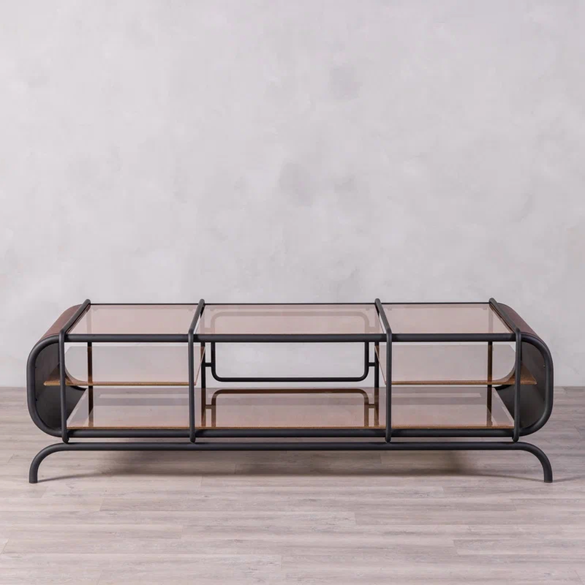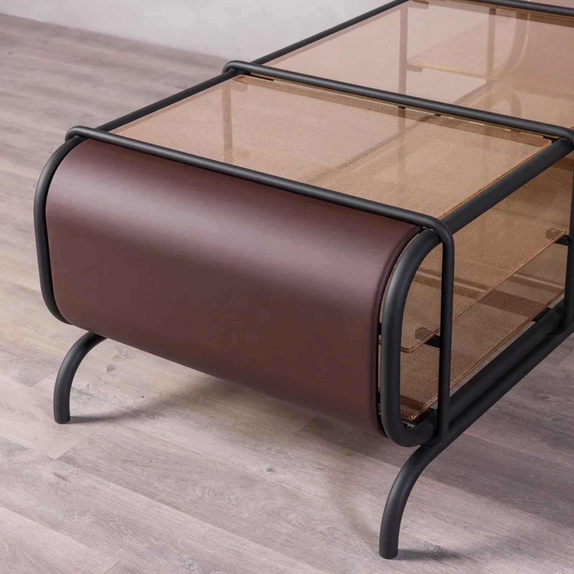 Благодаря инкрустации декоративной сеткой, серые стеклянные элементы создают мягкую игру света. Консоль будет уместной как в минималистичном интерьере, так и в более эклектичной обстановке, становясь эффектным акцентом.