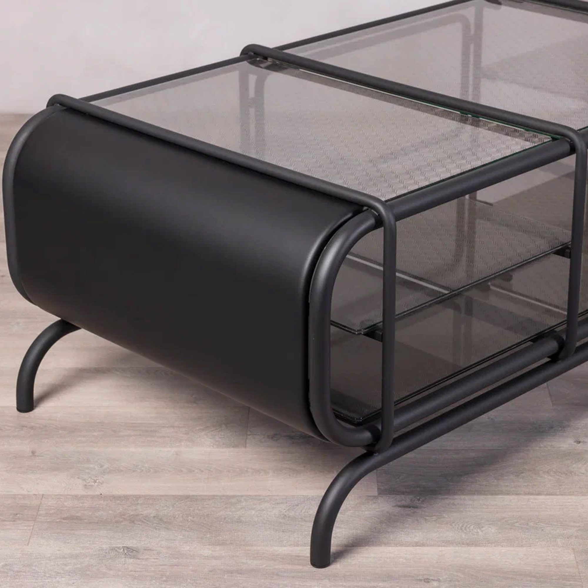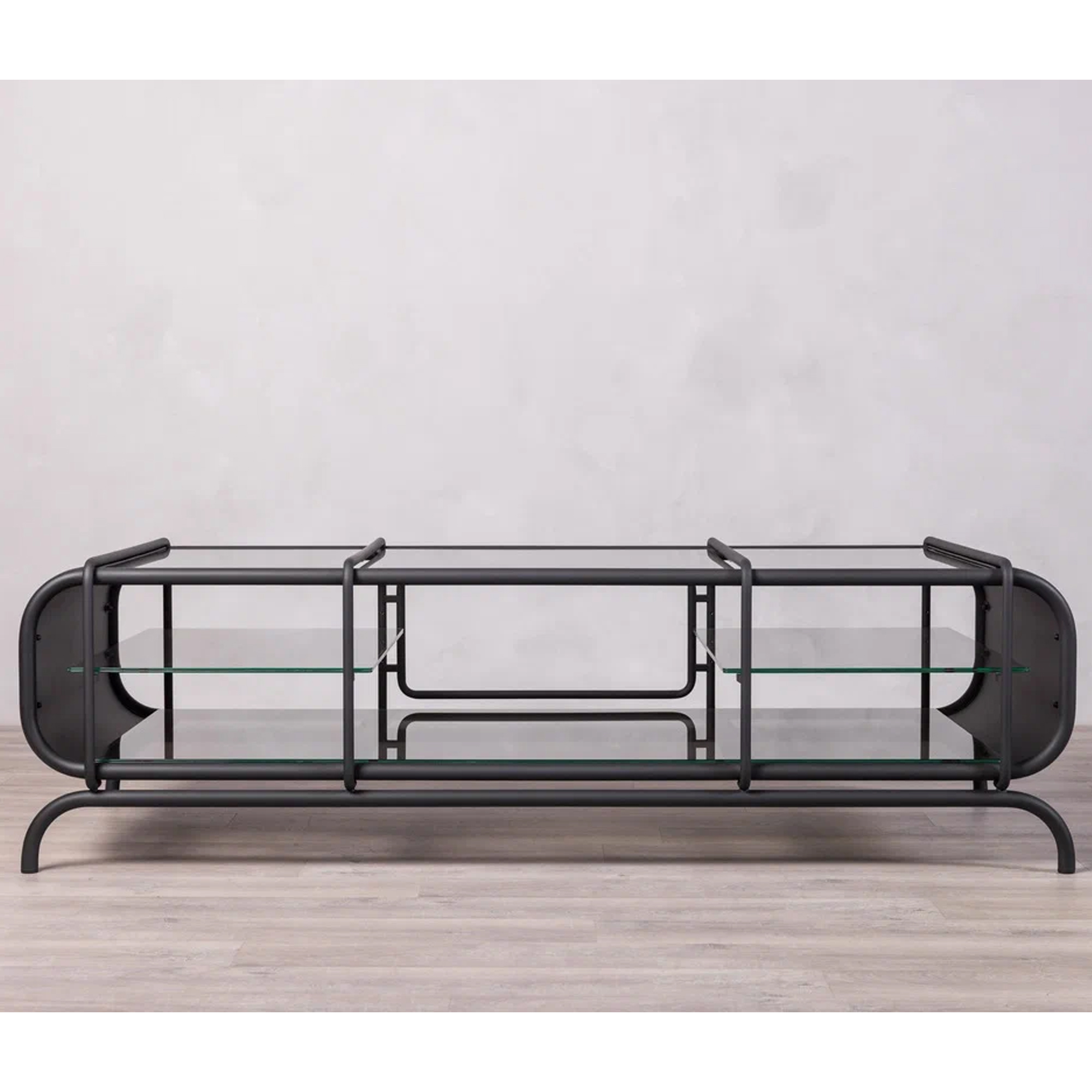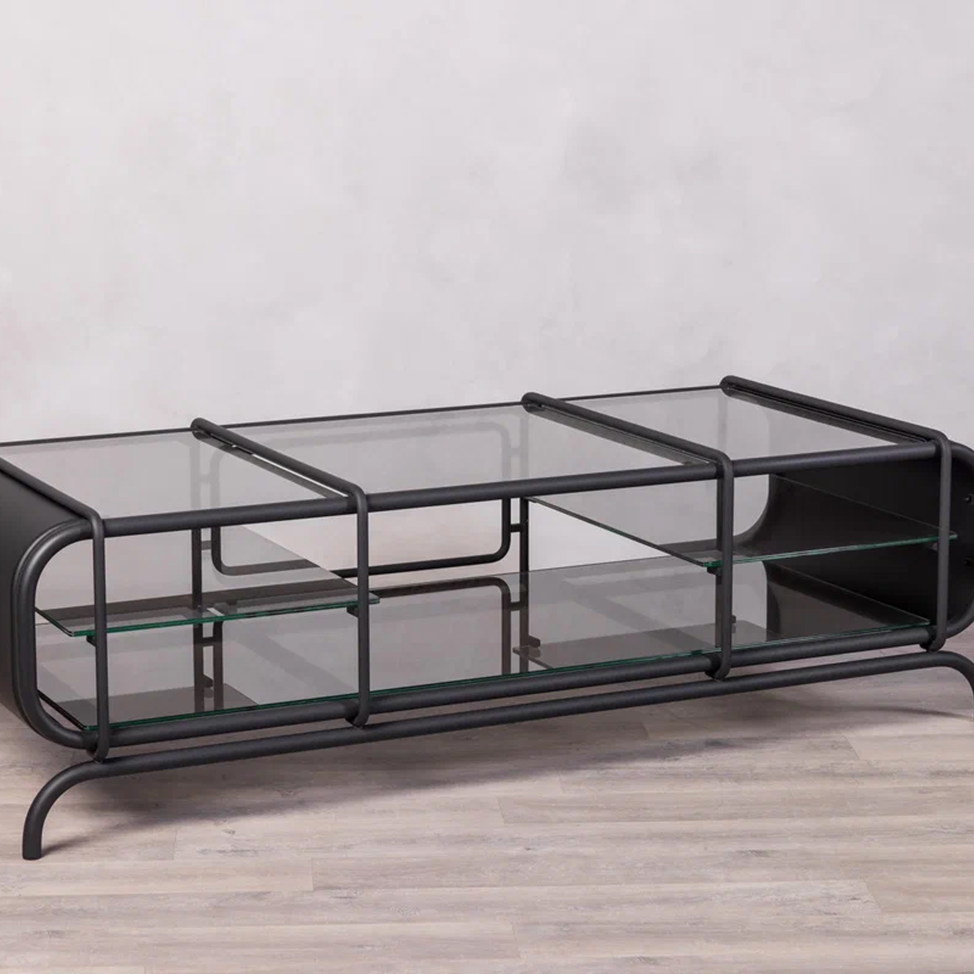 Благодаря инкрустации декоративной сеткой, серые стеклянные элементы создают мягкую игру света. Консоль будет уместной как в минималистичном интерьере, так и в более эклектичной обстановке, становясь эффектным акцентом.