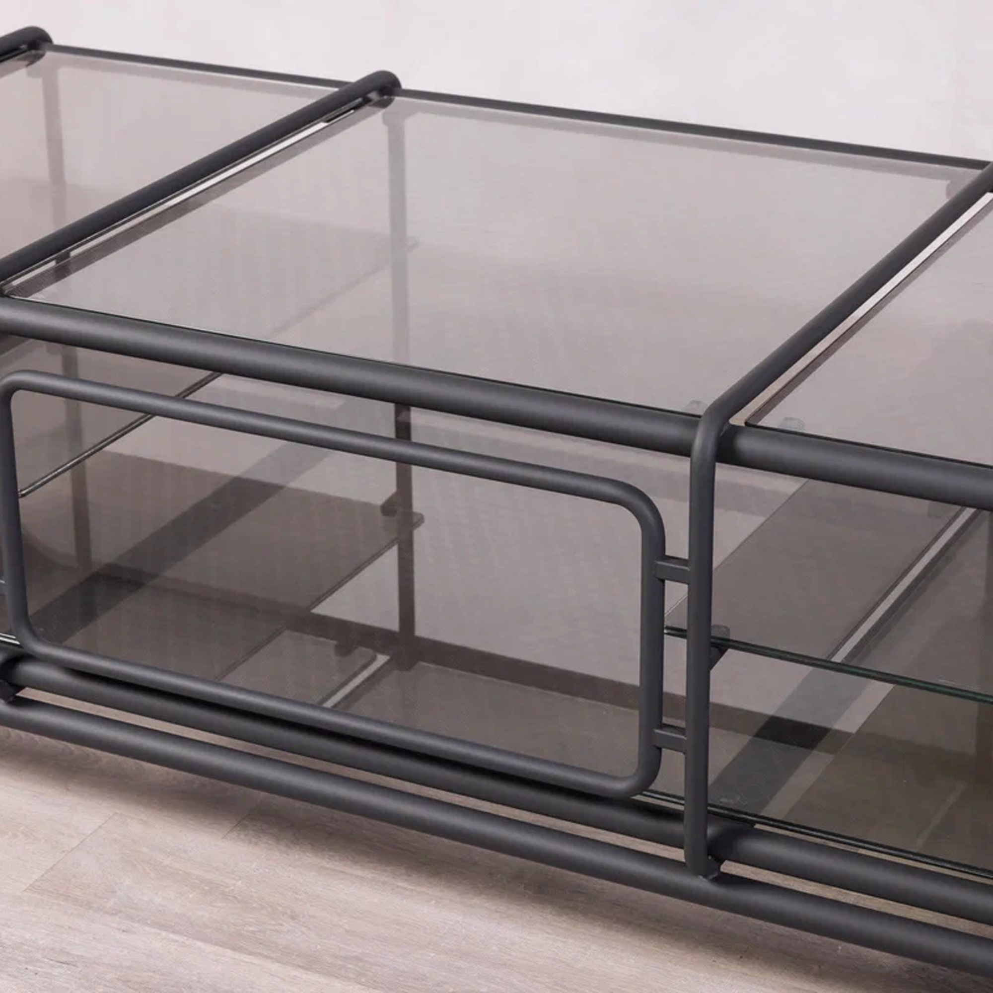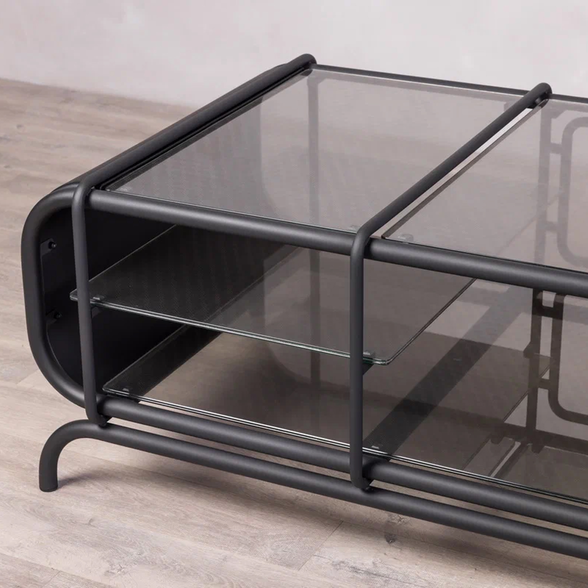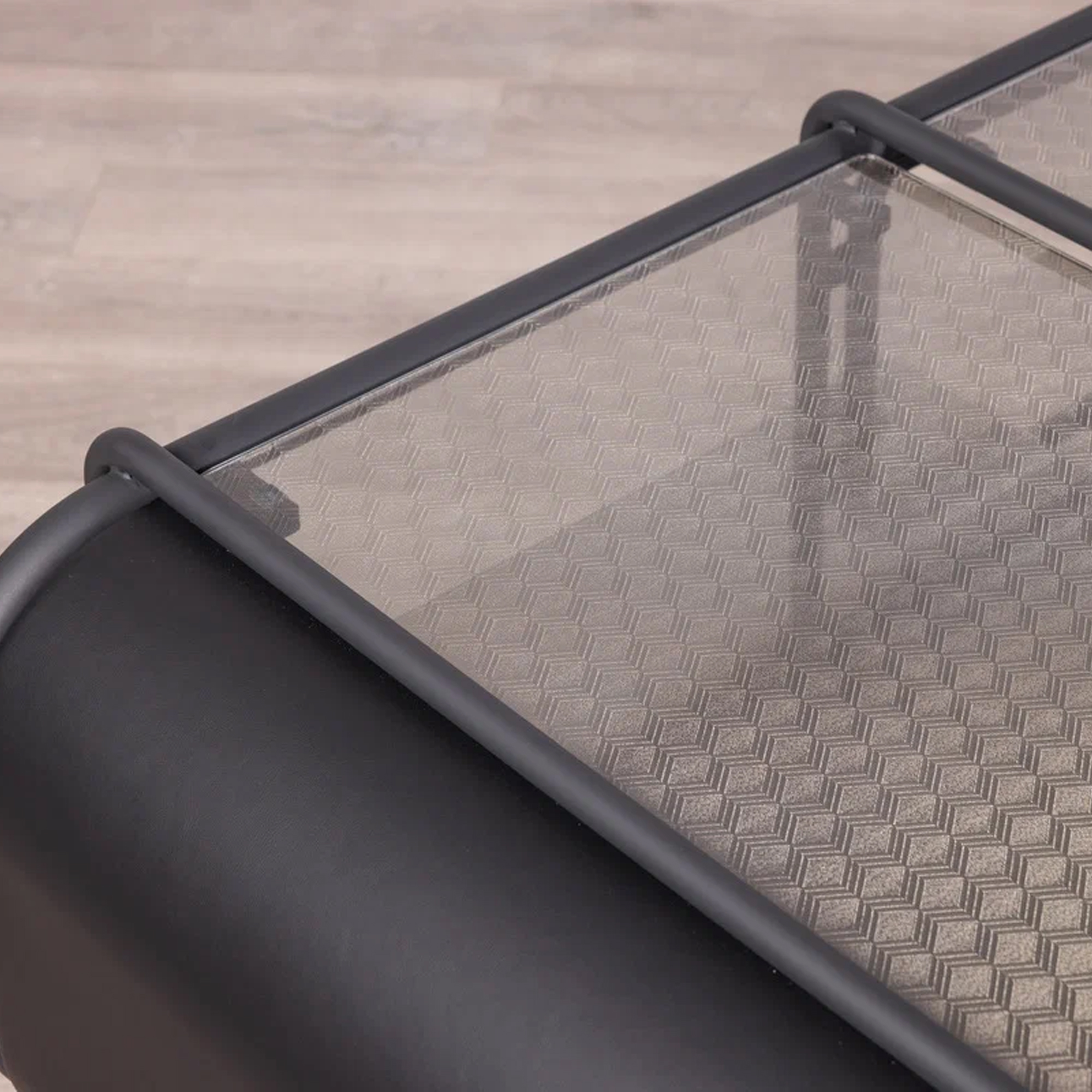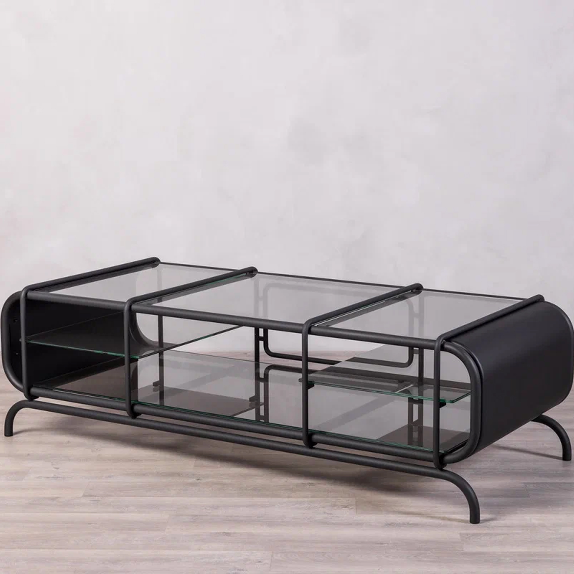 Благодаря инкрустации декоративной сеткой, серые стеклянные элементы создают мягкую игру света. Консоль будет уместной как в минималистичном интерьере, так и в более эклектичной обстановке, становясь эффектным акцентом.
