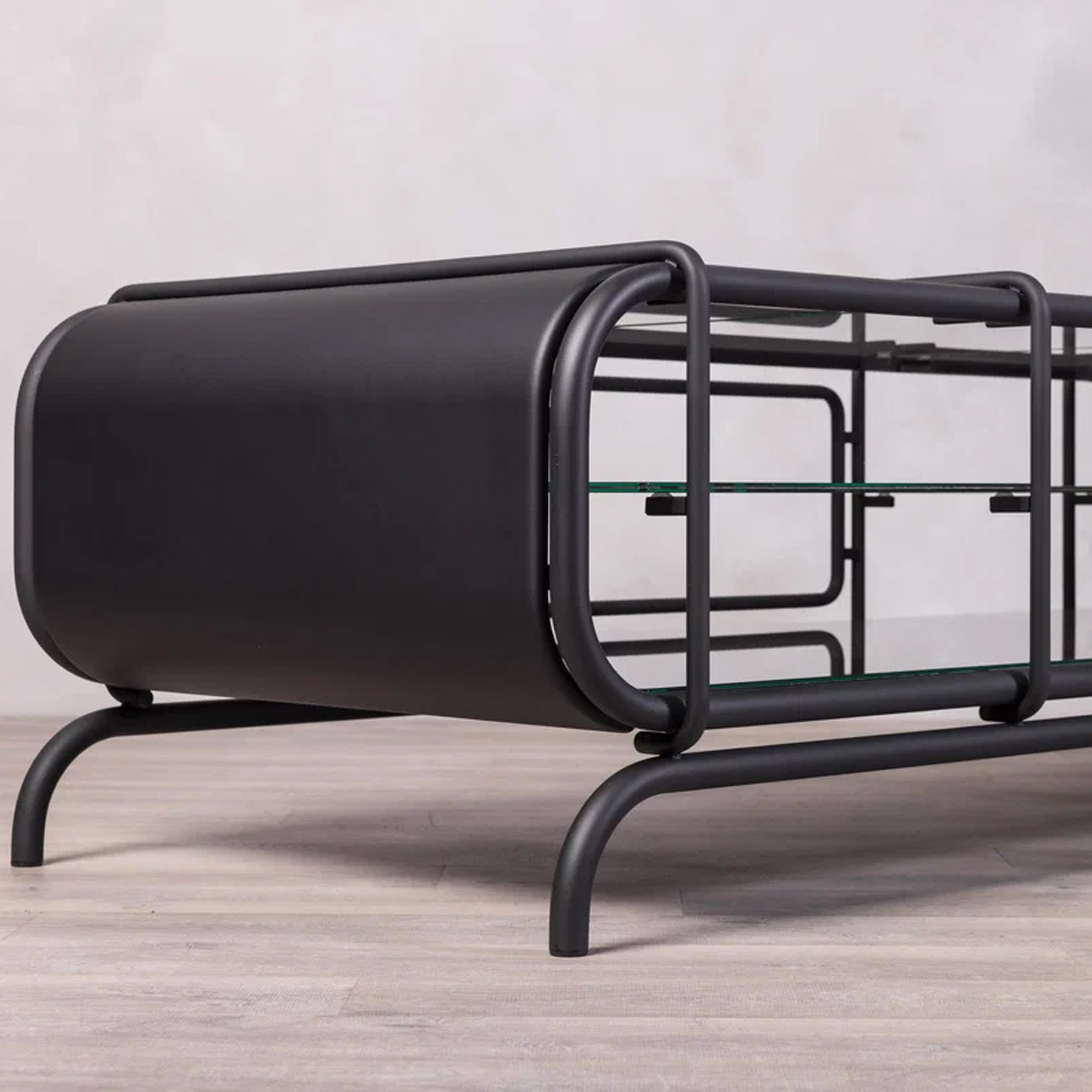 «Кинотека» — консоль, где строгая графика соединяется с плавными контурами панелей обтянутых черной экокожей.