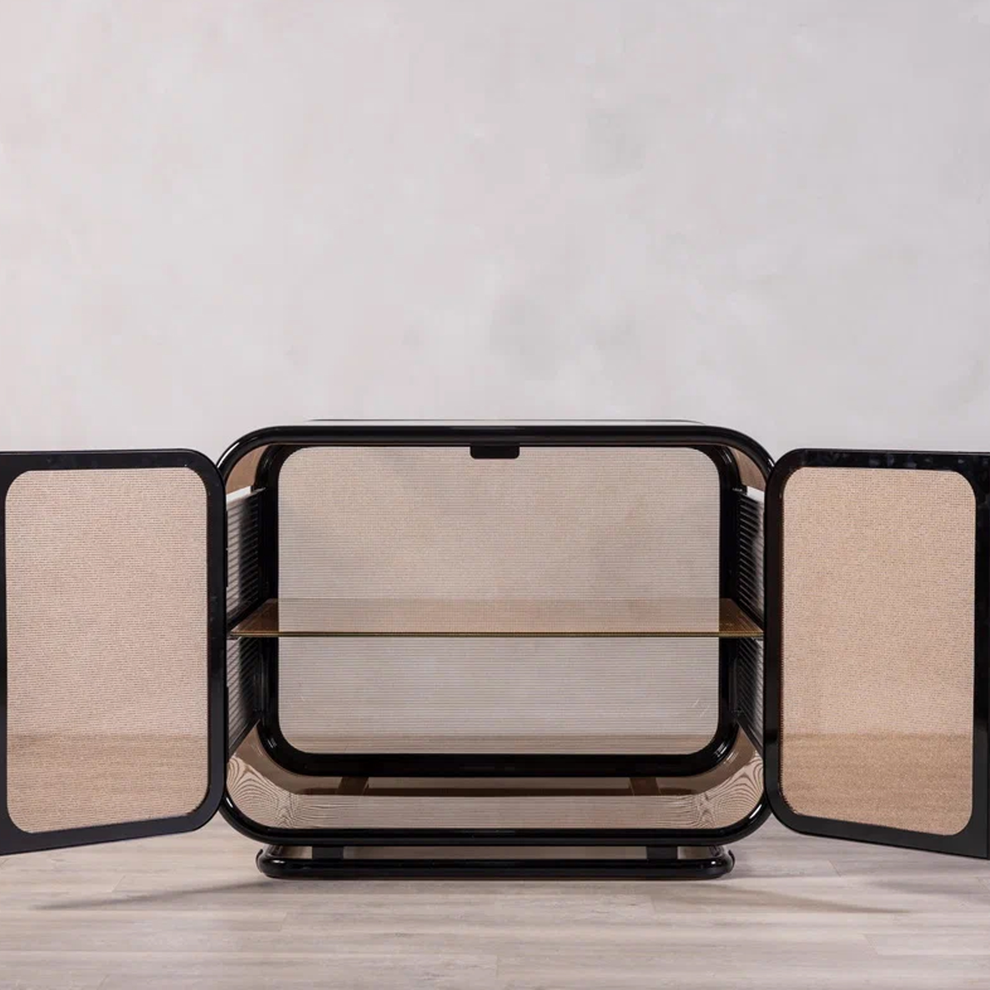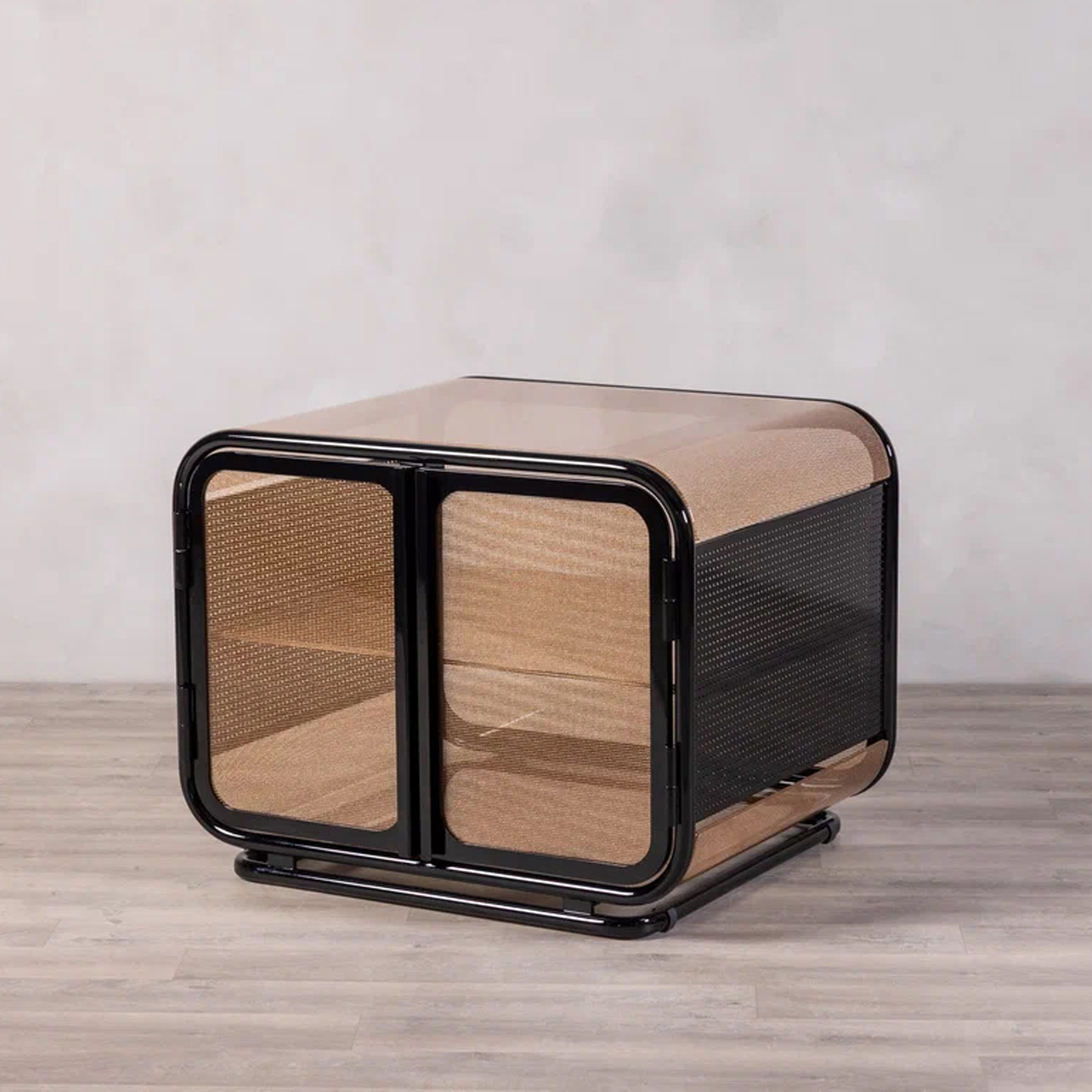 Полупрозрачное армированное стекло цвета бронзы, инкрустированное декоративной сеткой, смягчает образ и создает выразительную игру бликов. Приподнятая опора визуально облегчает форму изделия. «Куб» незаметно упорядочивает пространство, оставаясь стильным и функциональным элементом интерьера.