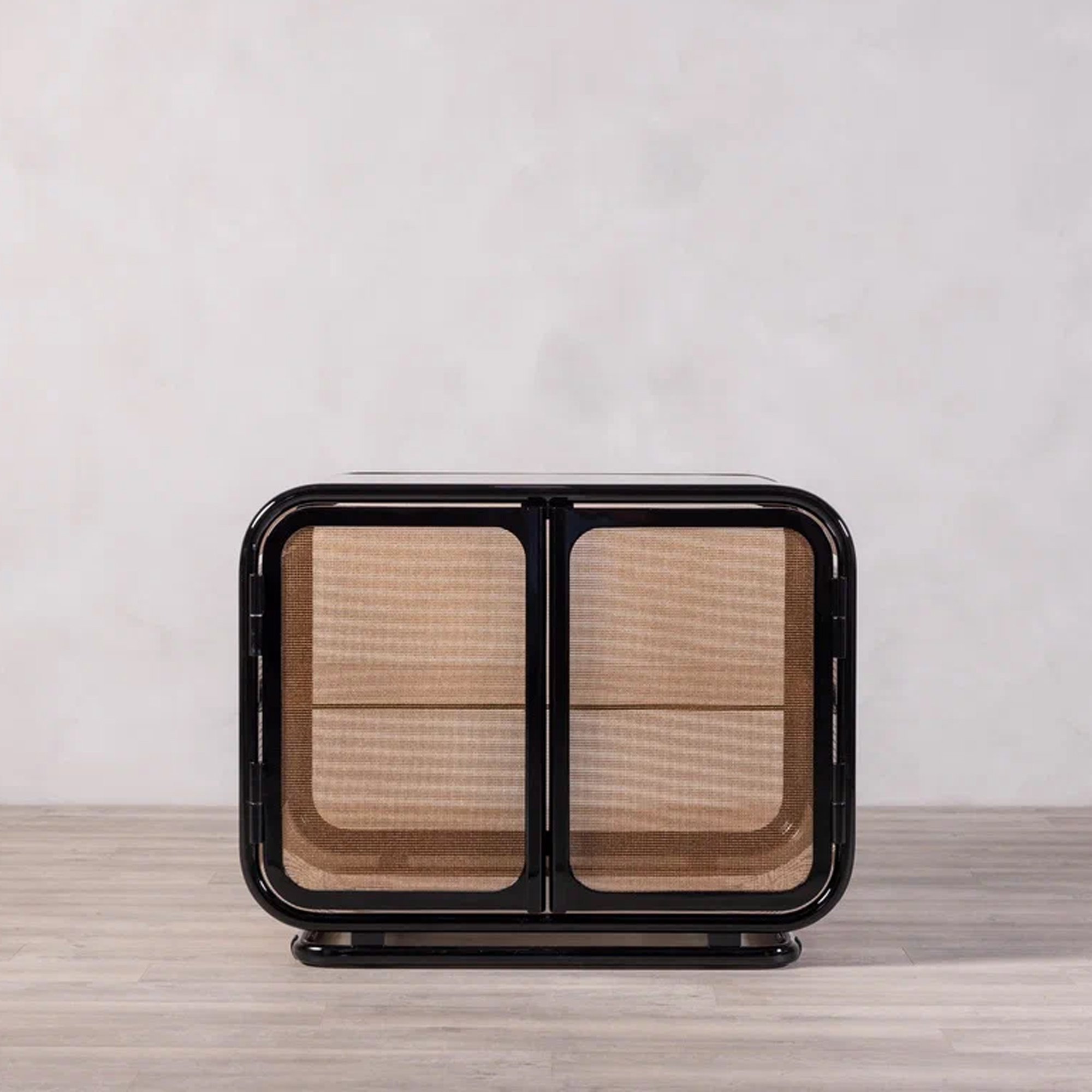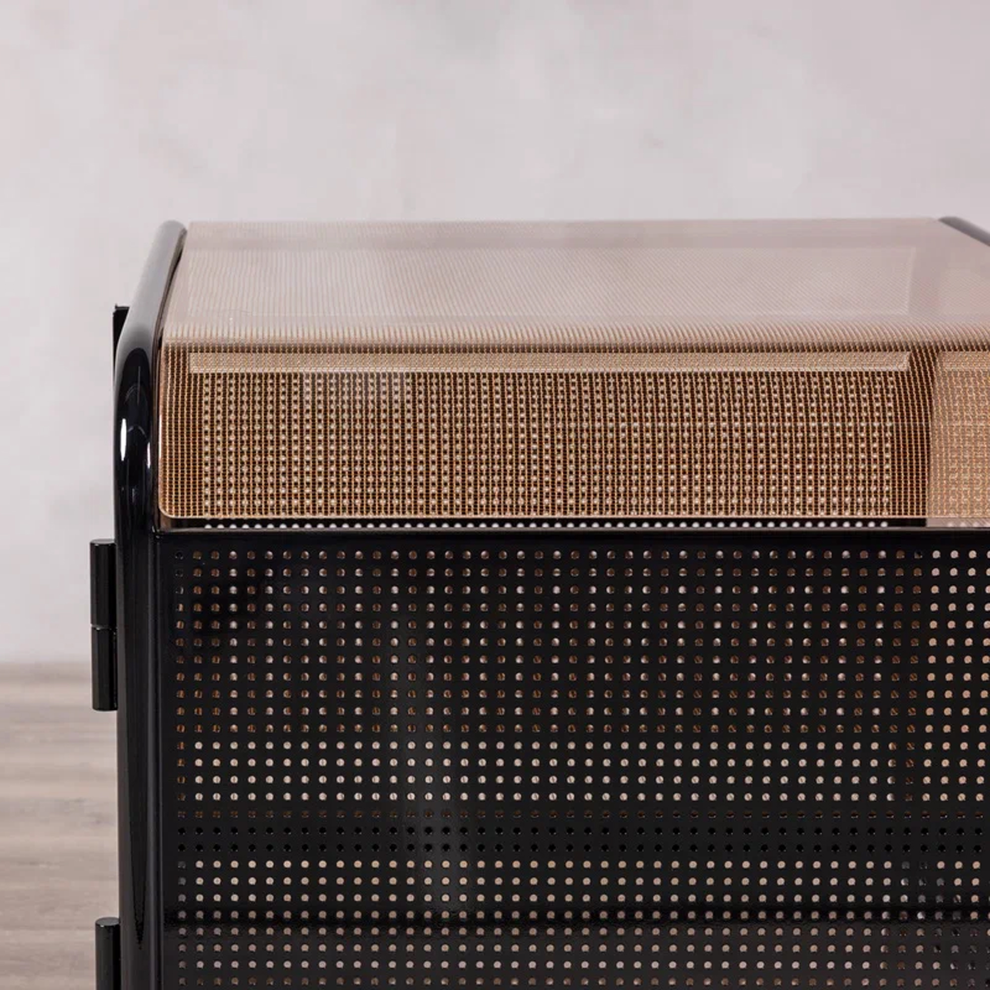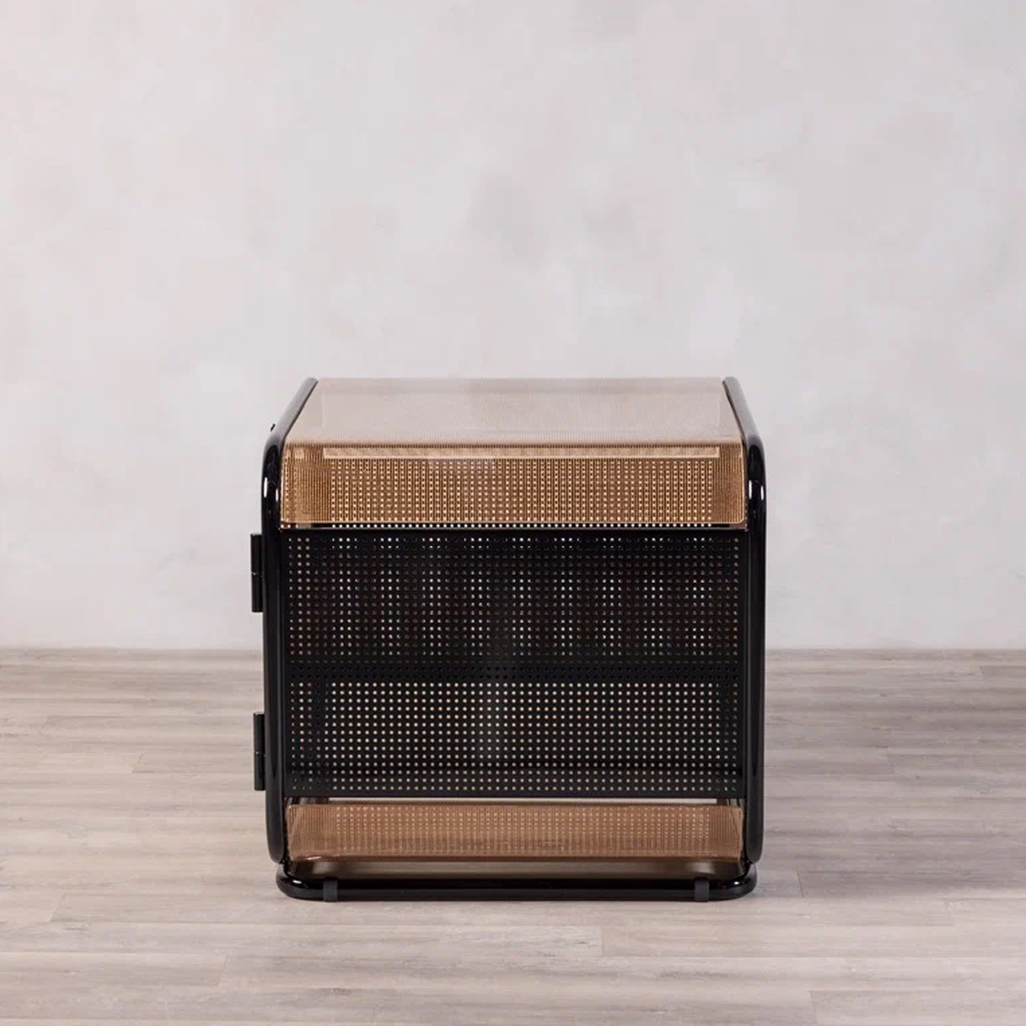 В тумбе «Куб» строгая геометрия встречается с лёгкостью и воздушностью. Черный глянцевый каркас из прочного металла задает четкий силуэт и обеспечивает прочность и устойчивость конструкции, а перфорированные боковые панели добавляют ритмичность и технологичный характер.