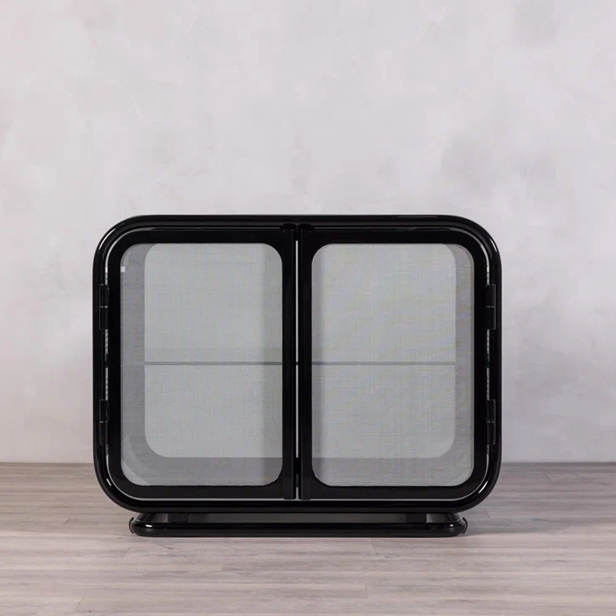 Полупрозрачное армированное стекло цвета серебра, инкрустированное декоративной сеткой, смягчает образ и создает выразительную игру бликов. Приподнятая опора визуально облегчает форму изделия. «Куб» незаметно упорядочивает пространство, оставаясь стильным и функциональным элементом интерьера.