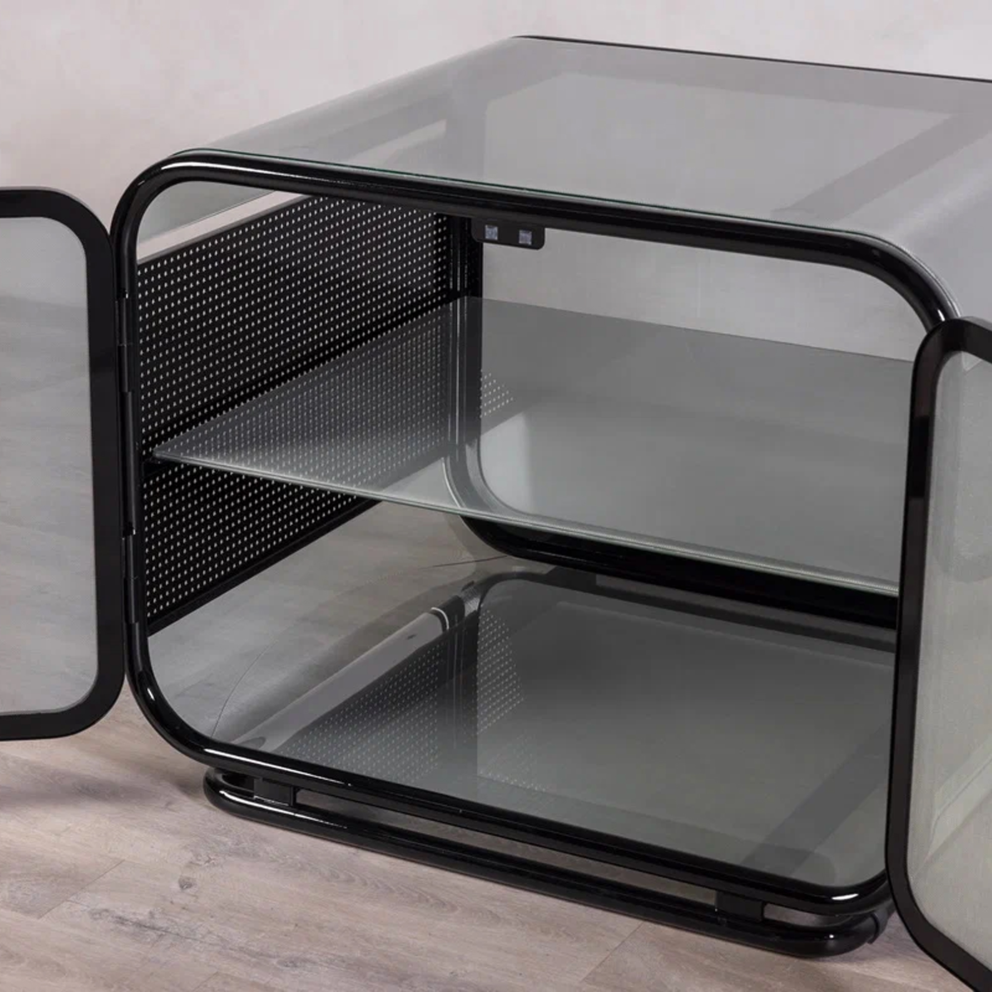 В тумбе «Куб» строгая геометрия встречается с лёгкостью и воздушностью. Черный глянцевый каркас из прочного металла задает четкий силуэт и обеспечивает прочность и устойчивость конструкции, а перфорированные боковые панели добавляют ритмичность и технологичный характер.