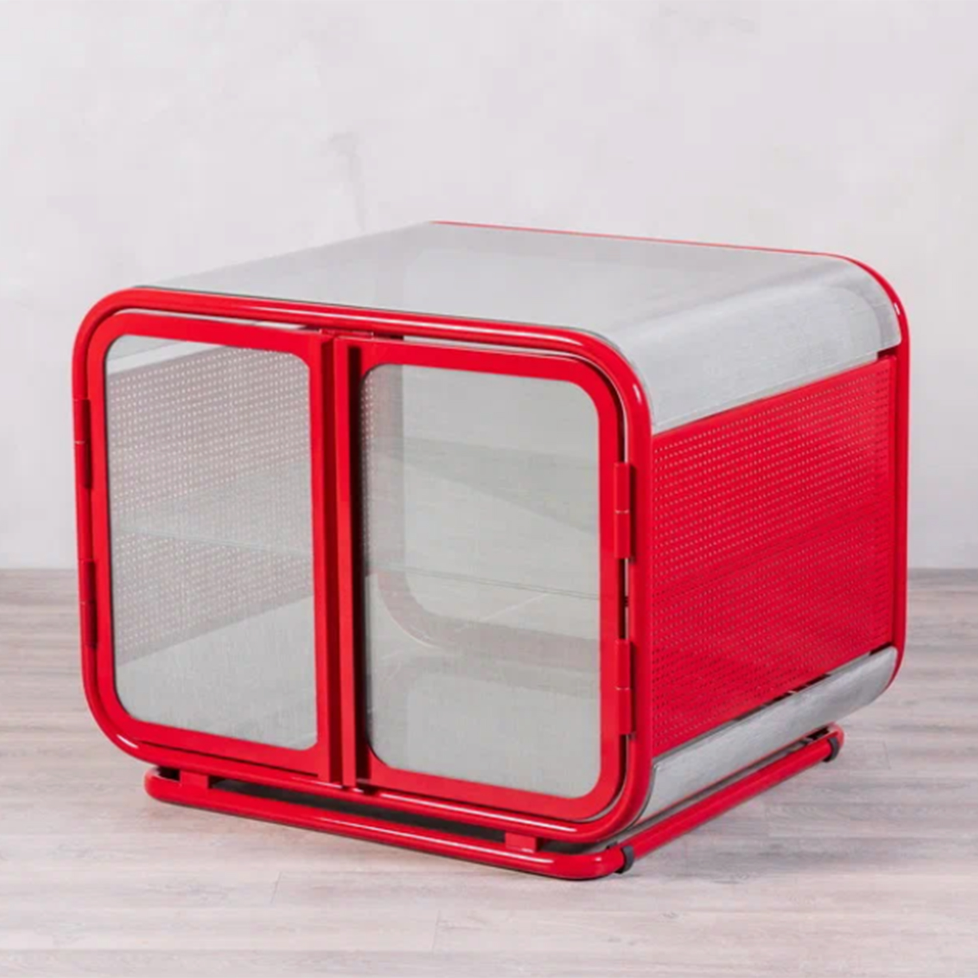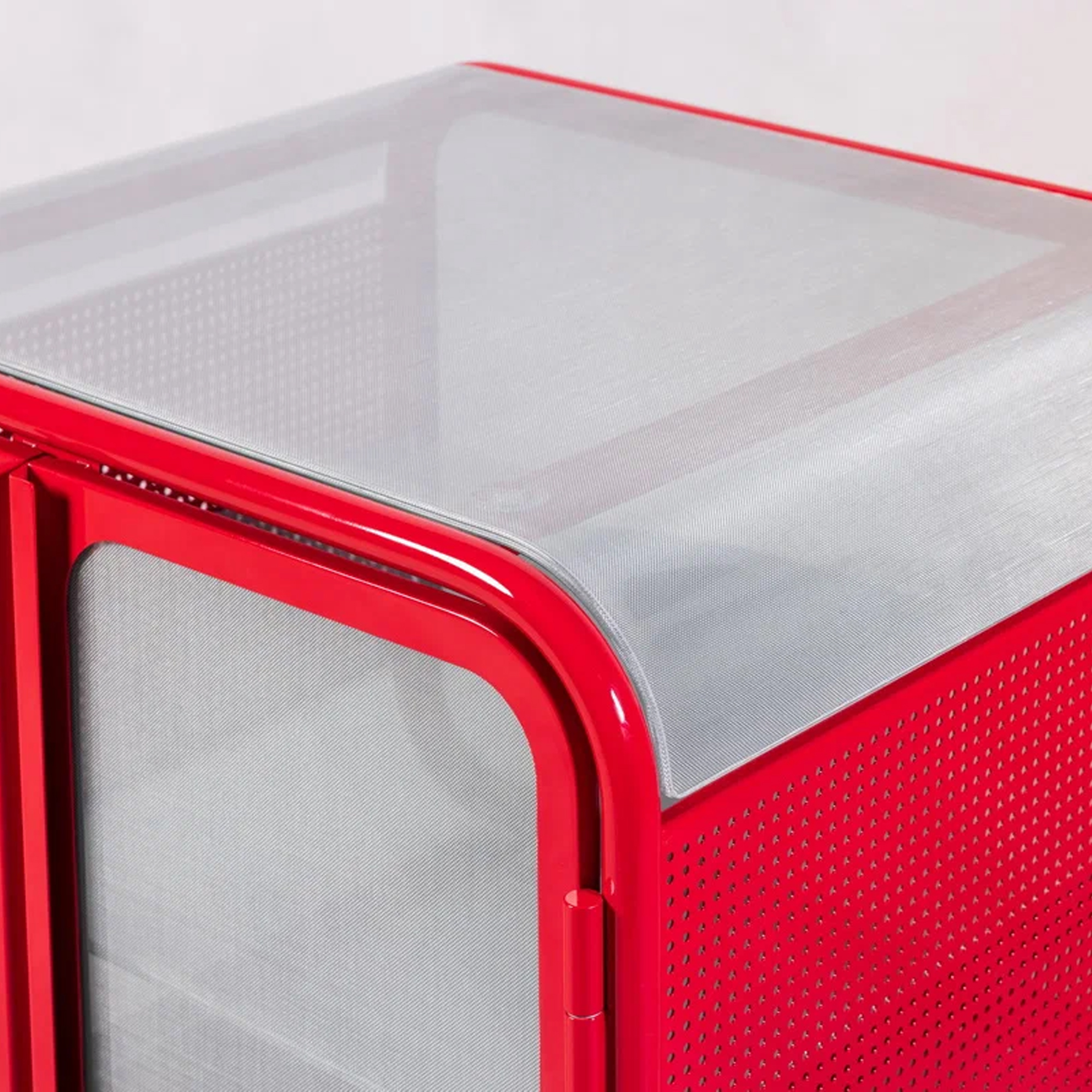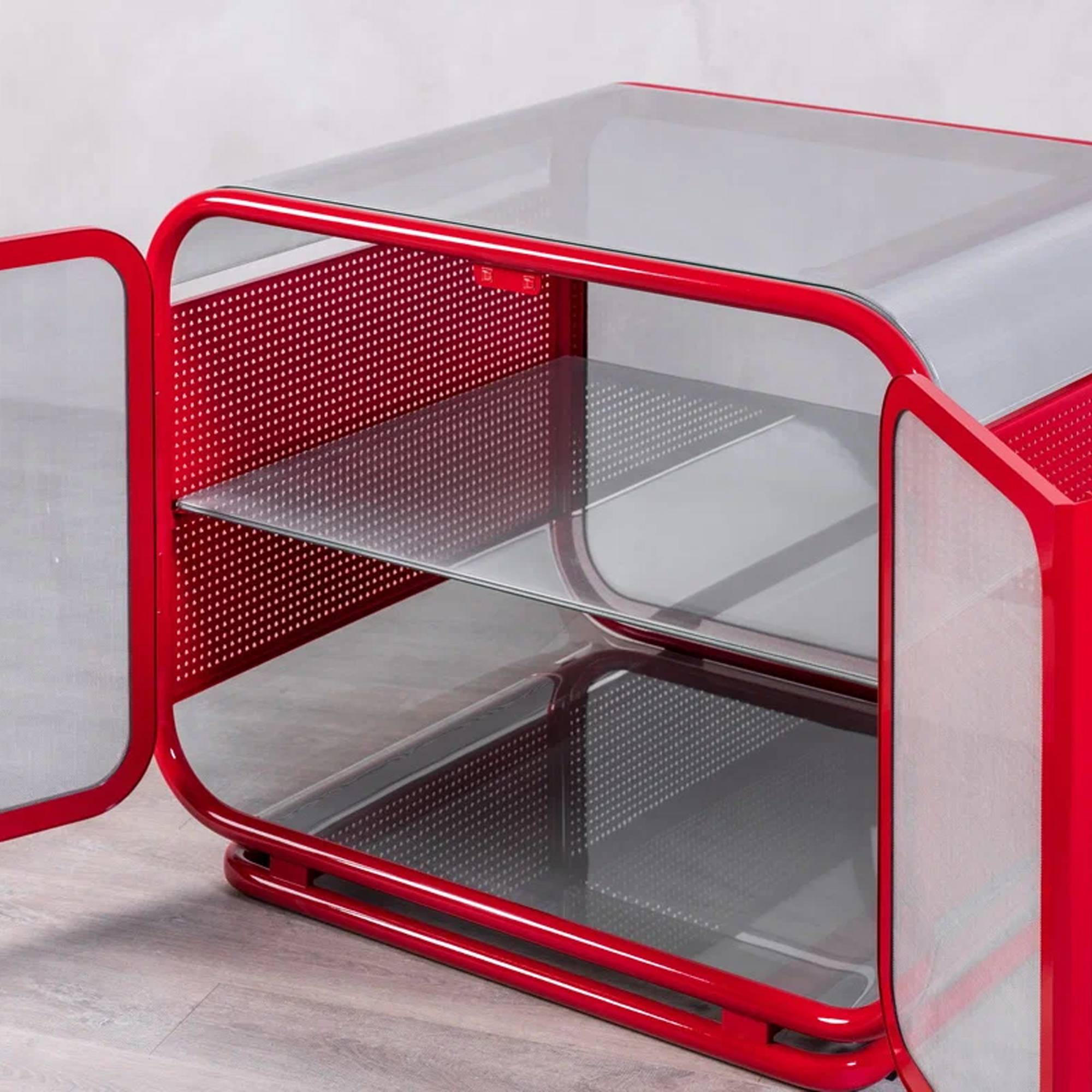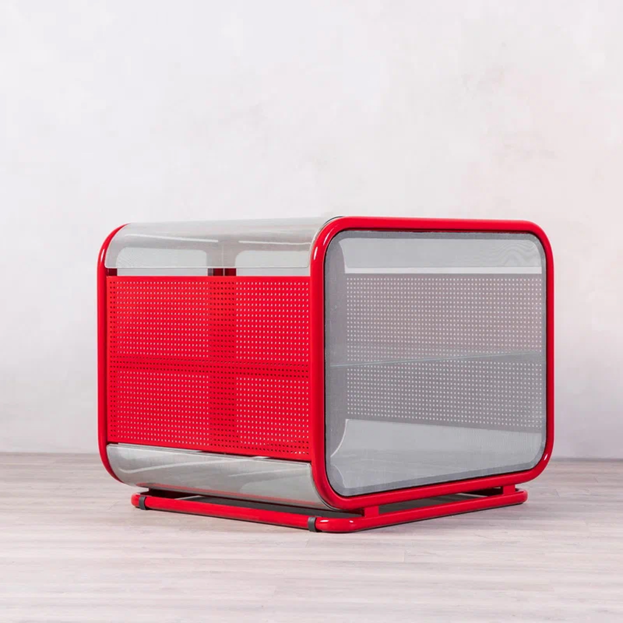 В тумбе «Куб» строгая геометрия встречается с лёгкостью и воздушностью. Красный глянцевый каркас из прочного металла задает четкий силуэт и обеспечивает прочность и устойчивость конструкции, а перфорированные боковые панели добавляют ритмичность и технологичный характер.