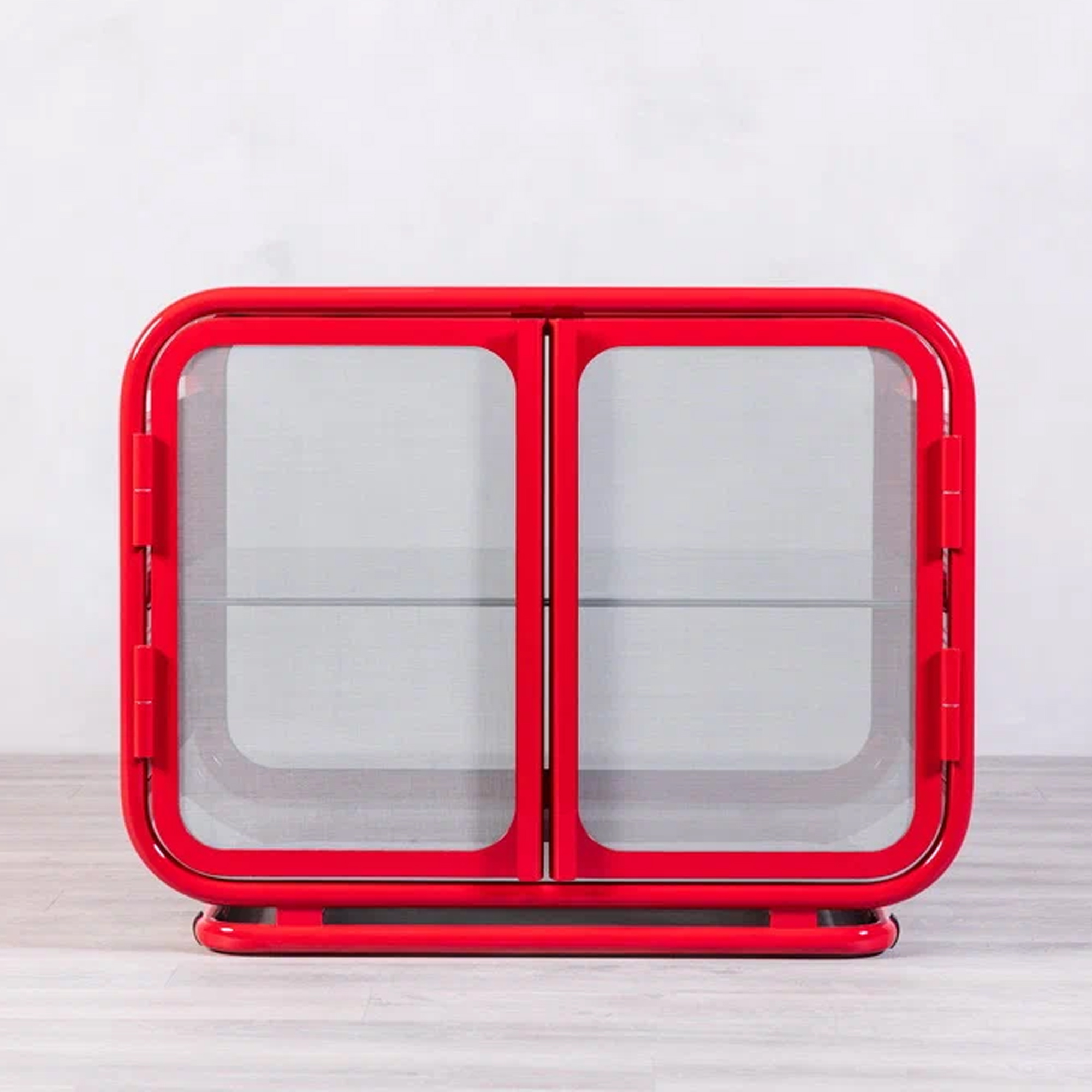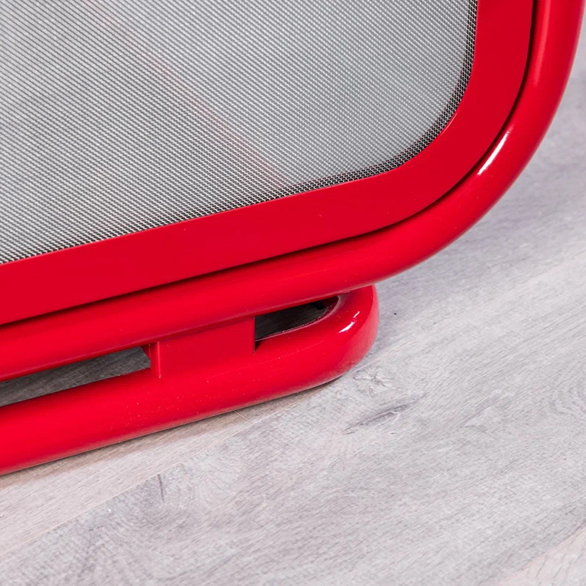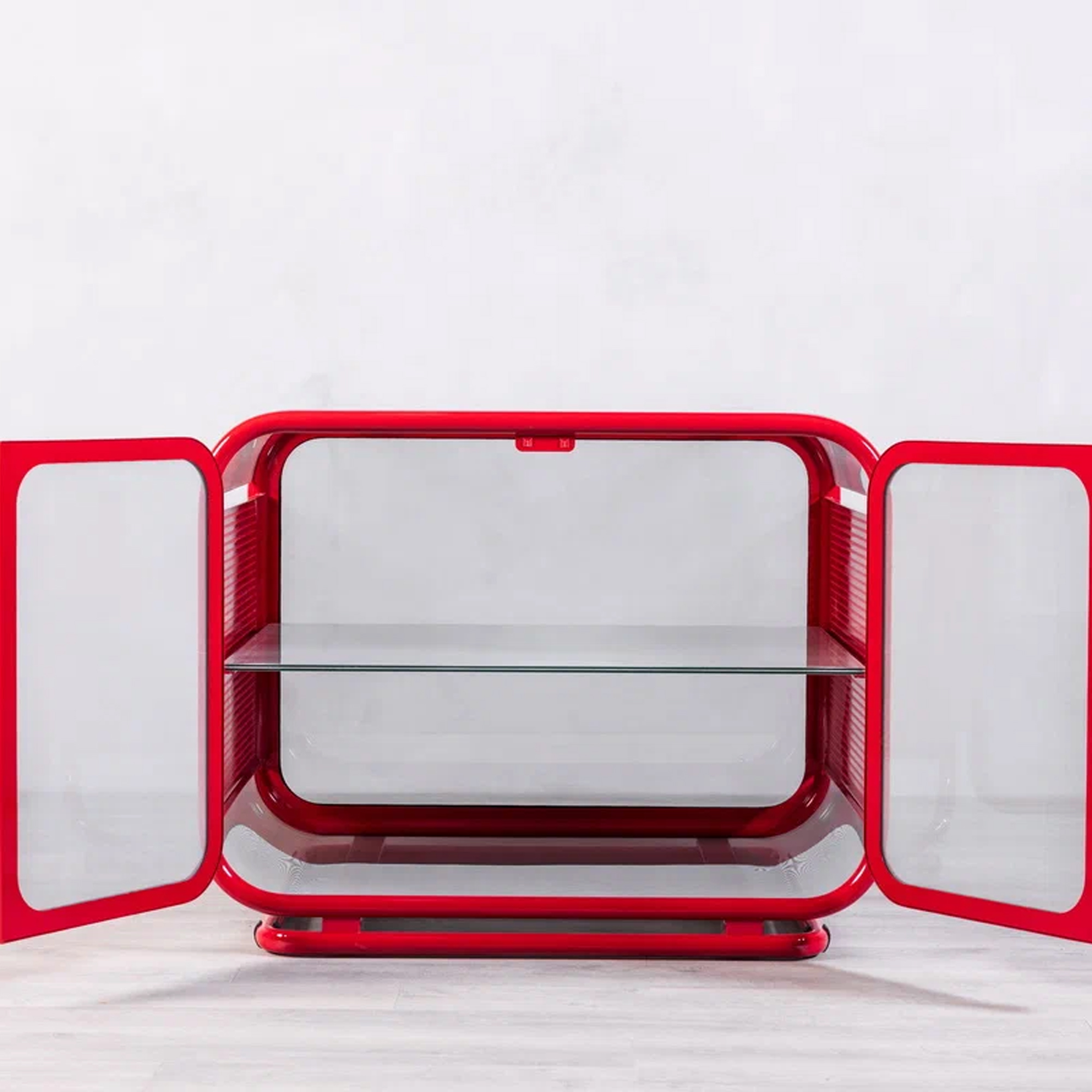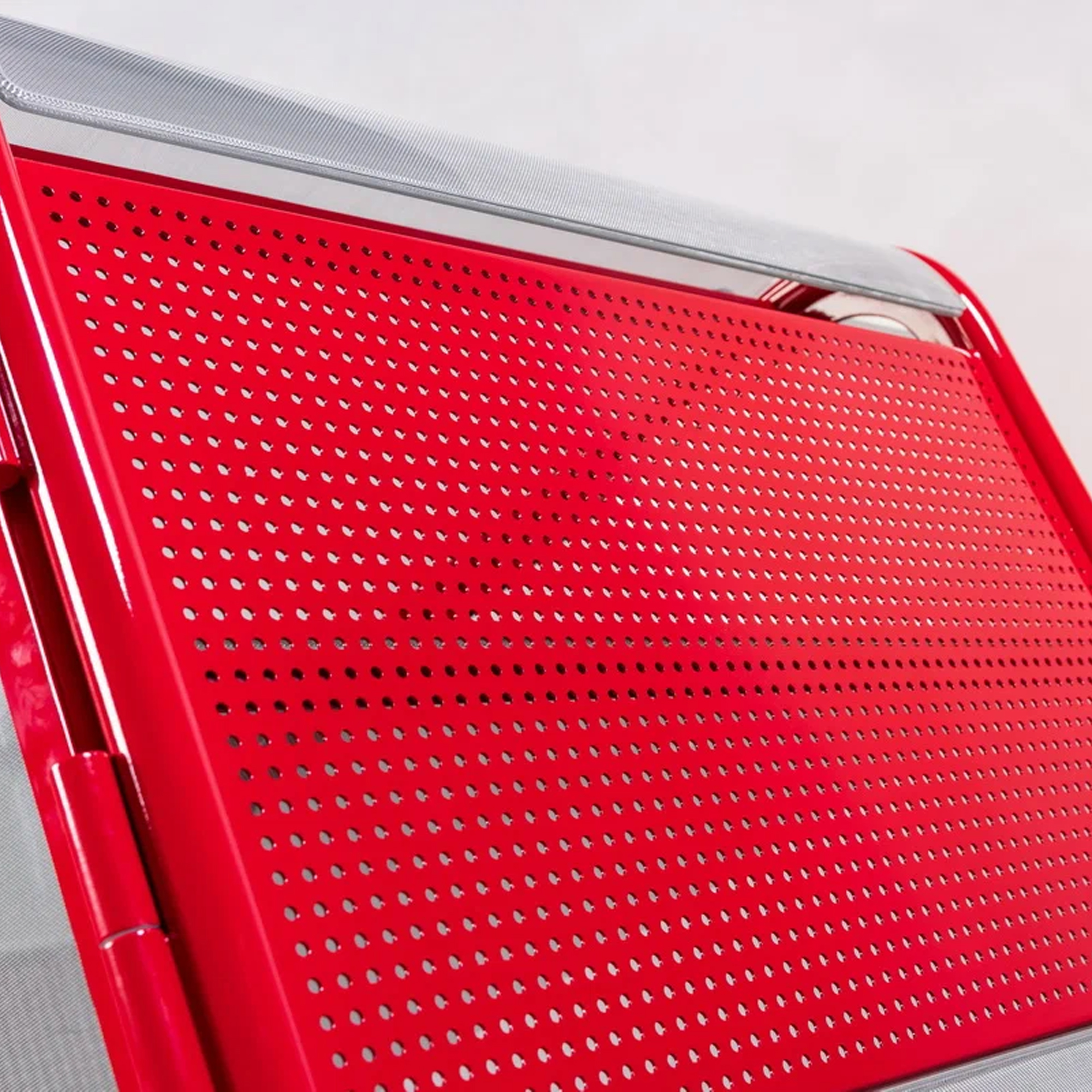В тумбе «Куб» строгая геометрия встречается с лёгкостью и воздушностью. Красный глянцевый каркас из прочного металла задает четкий силуэт и обеспечивает прочность и устойчивость конструкции, а перфорированные боковые панели добавляют ритмичность и технологичный характер.