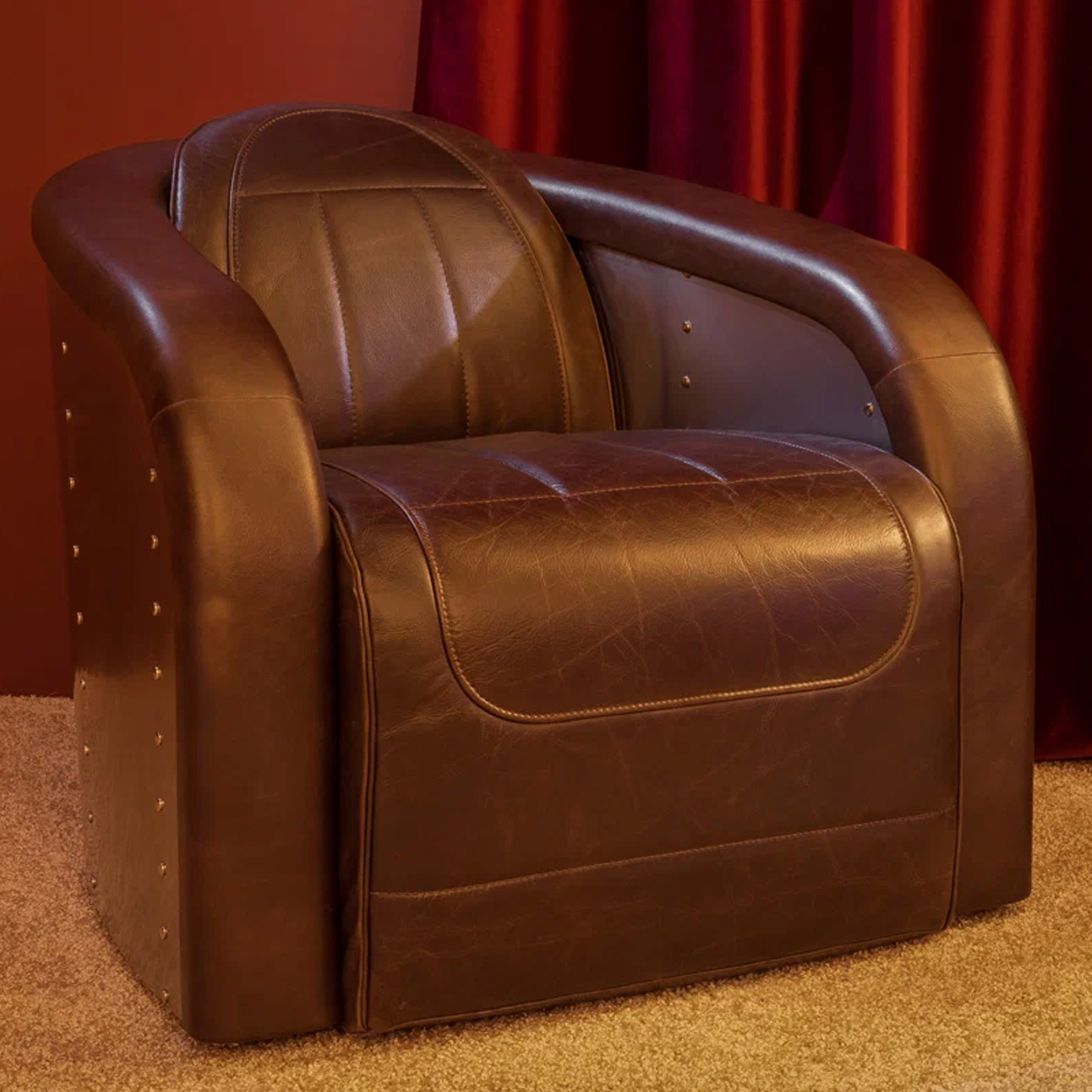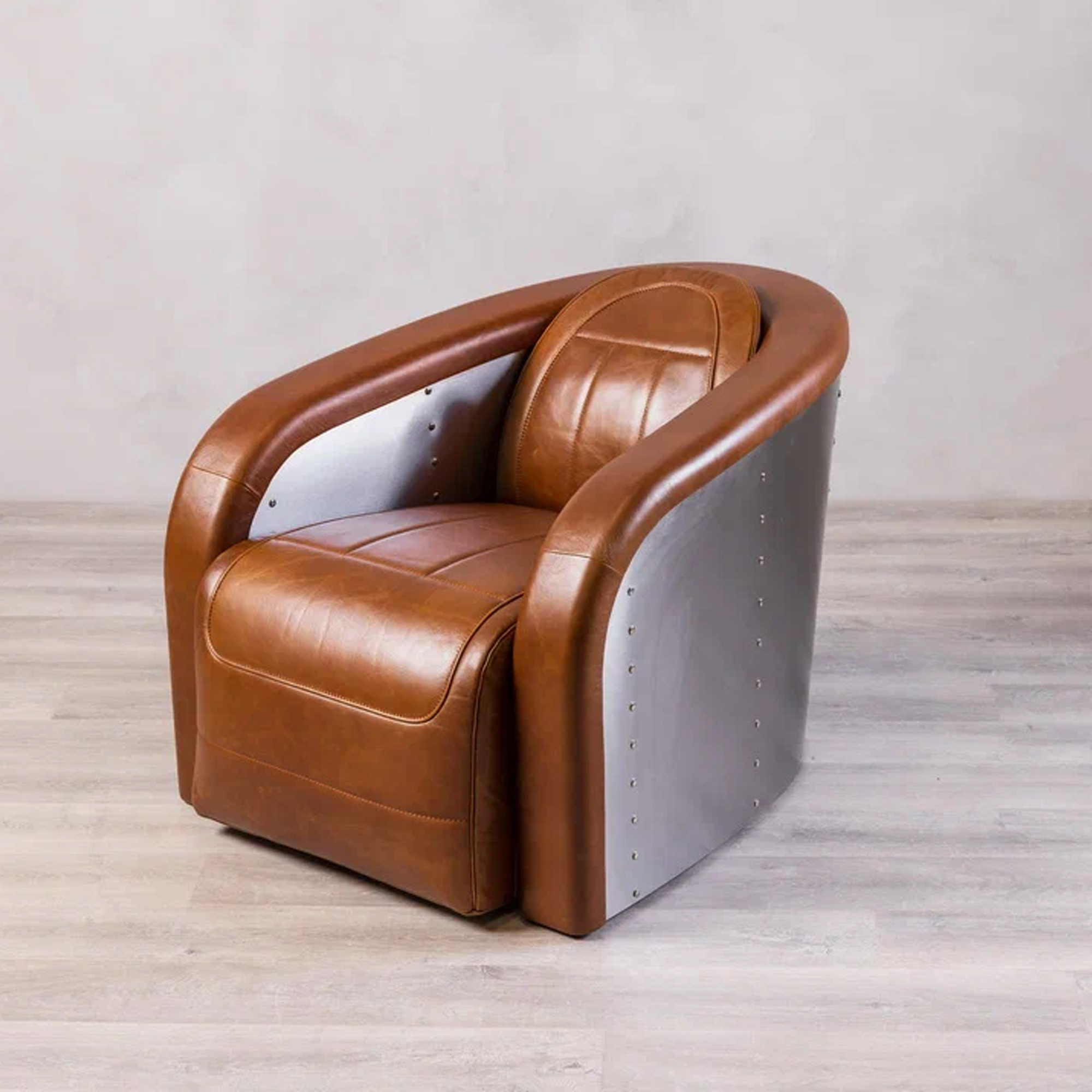 Это кожаное кресло — идеальный союз ретро-эстетики и современного минимализма. Глубокий оттенок винтажной кожи коричневого цвета в сочетании с холодным блеском брашированной нержавеющей стали превращает его в центральный элемент любого интерьера.