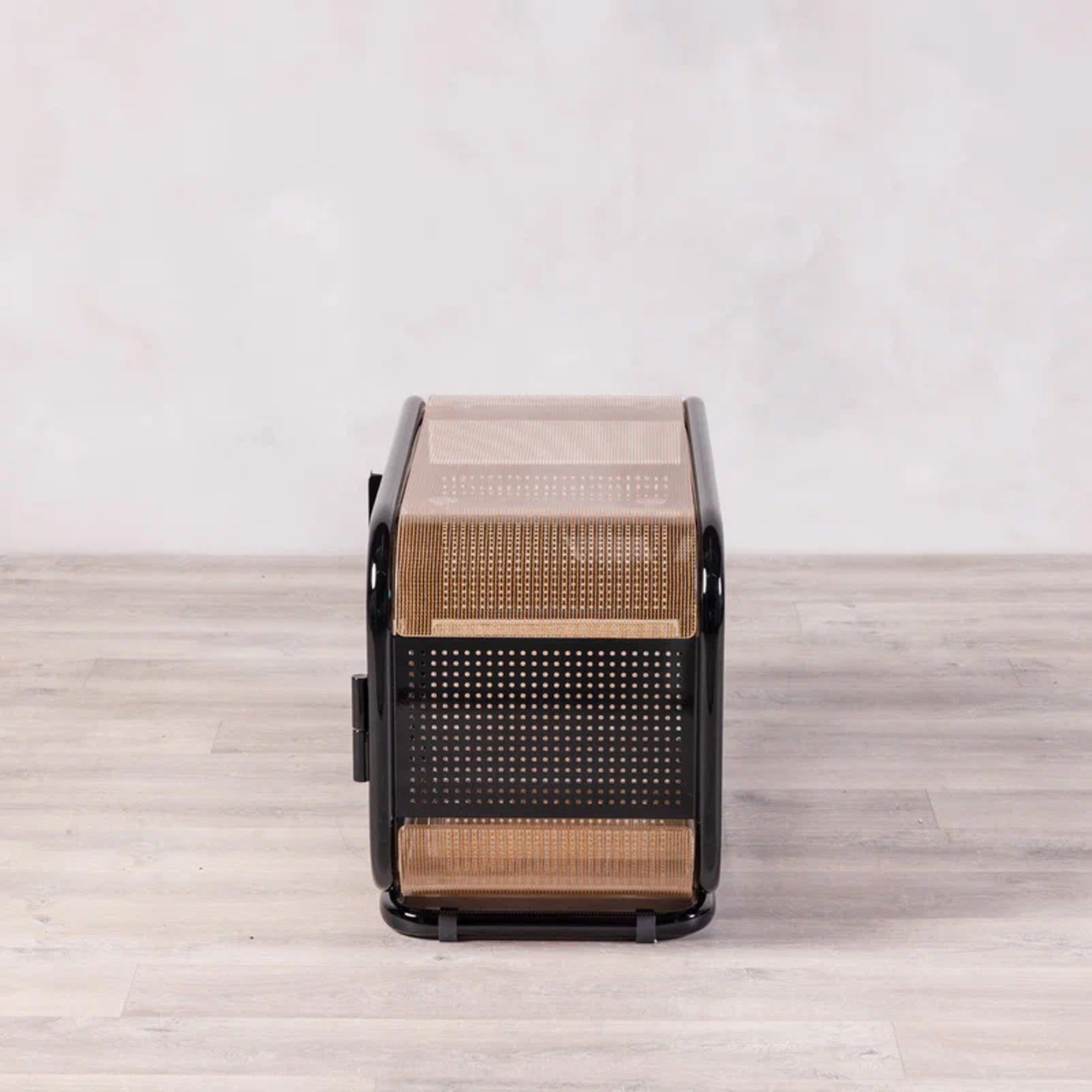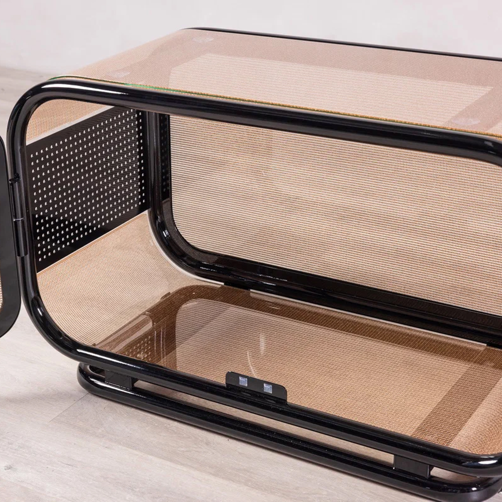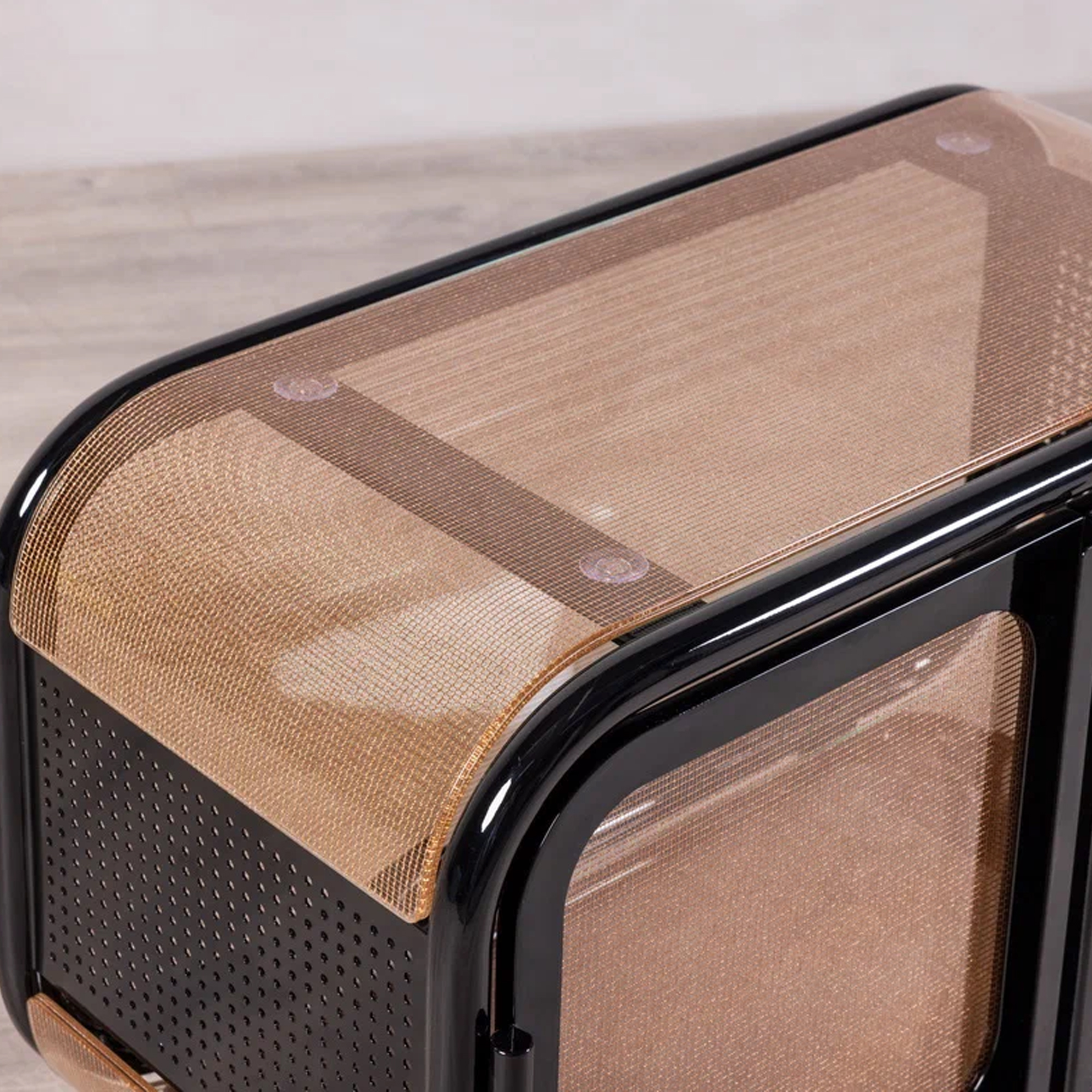 Металлический каркас: прочный контур из металла обеспечивает устойчивость и долговечность конструкции. Перфорация: боковые панели выполнены с перфорацией, что добавляет модели технологичности и легкости. Полупрозрачные армированные стеклянные элементы цвета серебра, инкрустированные декоративной сеткой, создают мягкую игру света и придают форме воздушность.