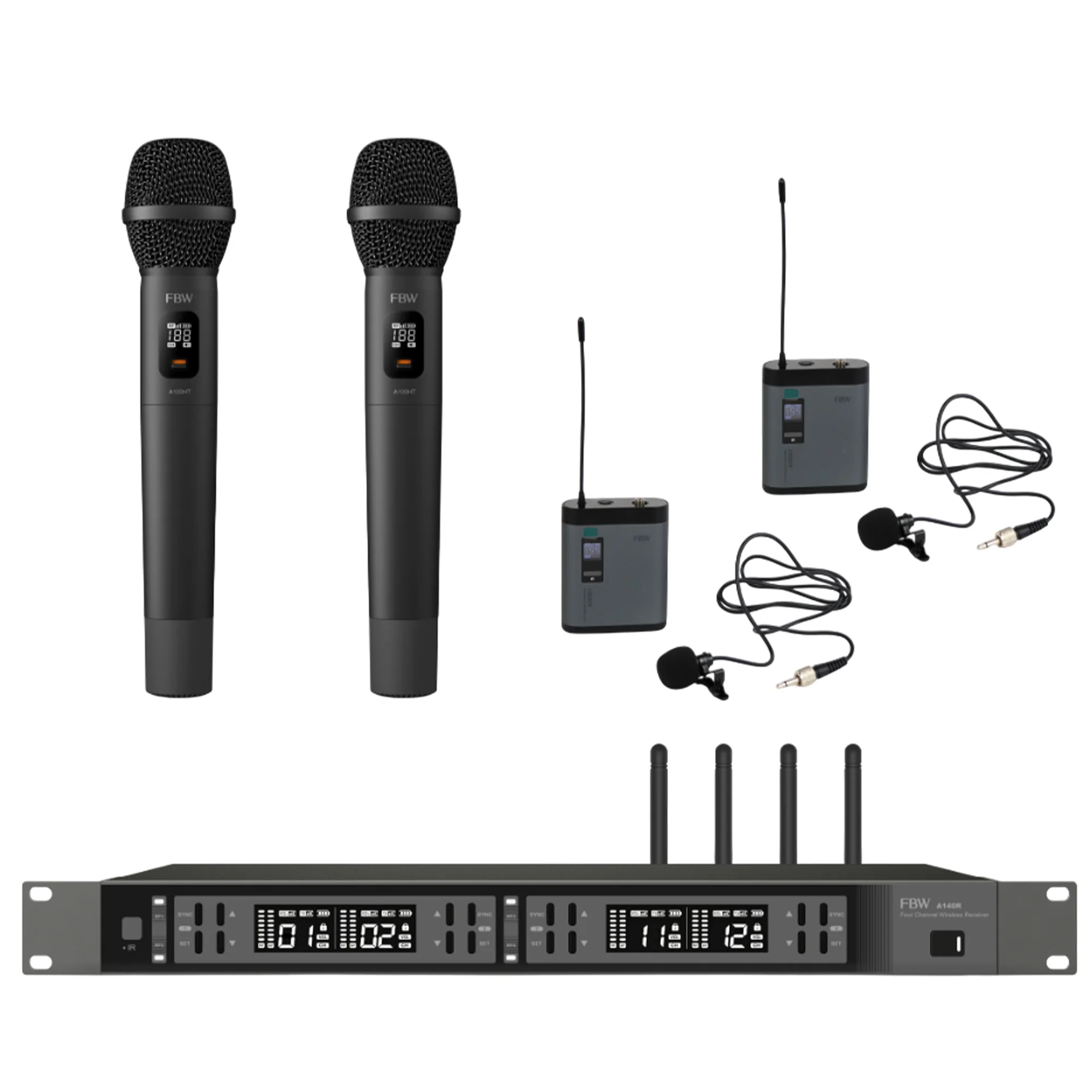 Четырехканальный радиоприёмник FBW A140R является базовым устройством при построении микрофонных радиосистем различного назначения. Работает с радиопередатчиками компании FBW (A100BT, A100CT, A100HT и A101HT) или иных производителей, при условии обмена данными на тех же несущих радиочастотах (UHF диапазон 512МГц - 562МГц, задается 100 фиксированных частот) и возможности синхронизации приемника с передатчиком посредством ИК-порта. Тип модуляции принимаемого от радиопередатчика акустического сигнала - FM (частотная).