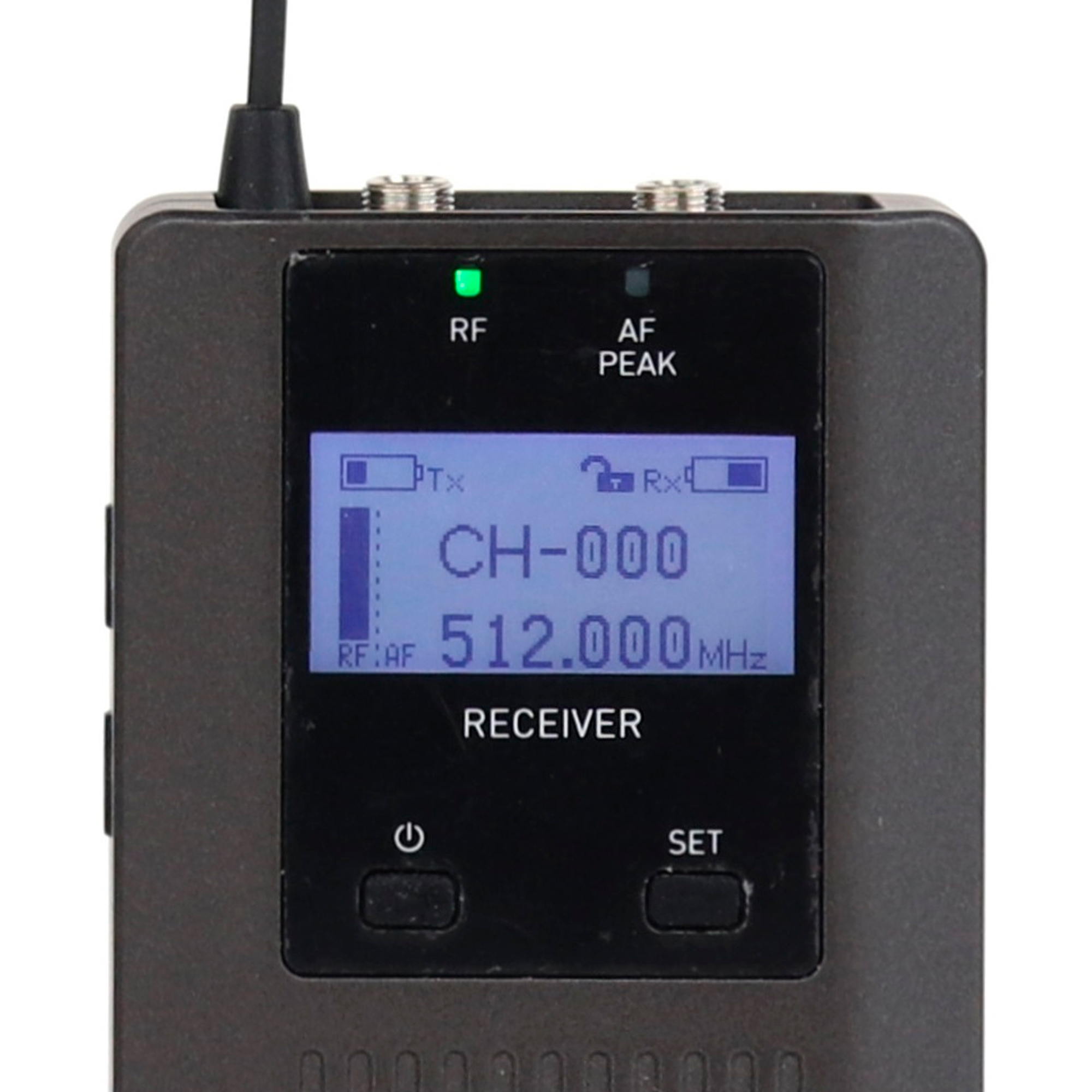 Тип модуляции принимаемого от радиопередатчика акустического сигнала - FM (частотная); рабочий диапазон акустических частот 30 -18 000 Гц. Аудиовыходы 2х Jack 3.5мм, расположены на верхней части корпуса рядом с антенной. На лицевой панели размещен дисплей, на котором отображается текущая частота, мощность и полезная служебная информация, включая параметры для программирования передатчиков.