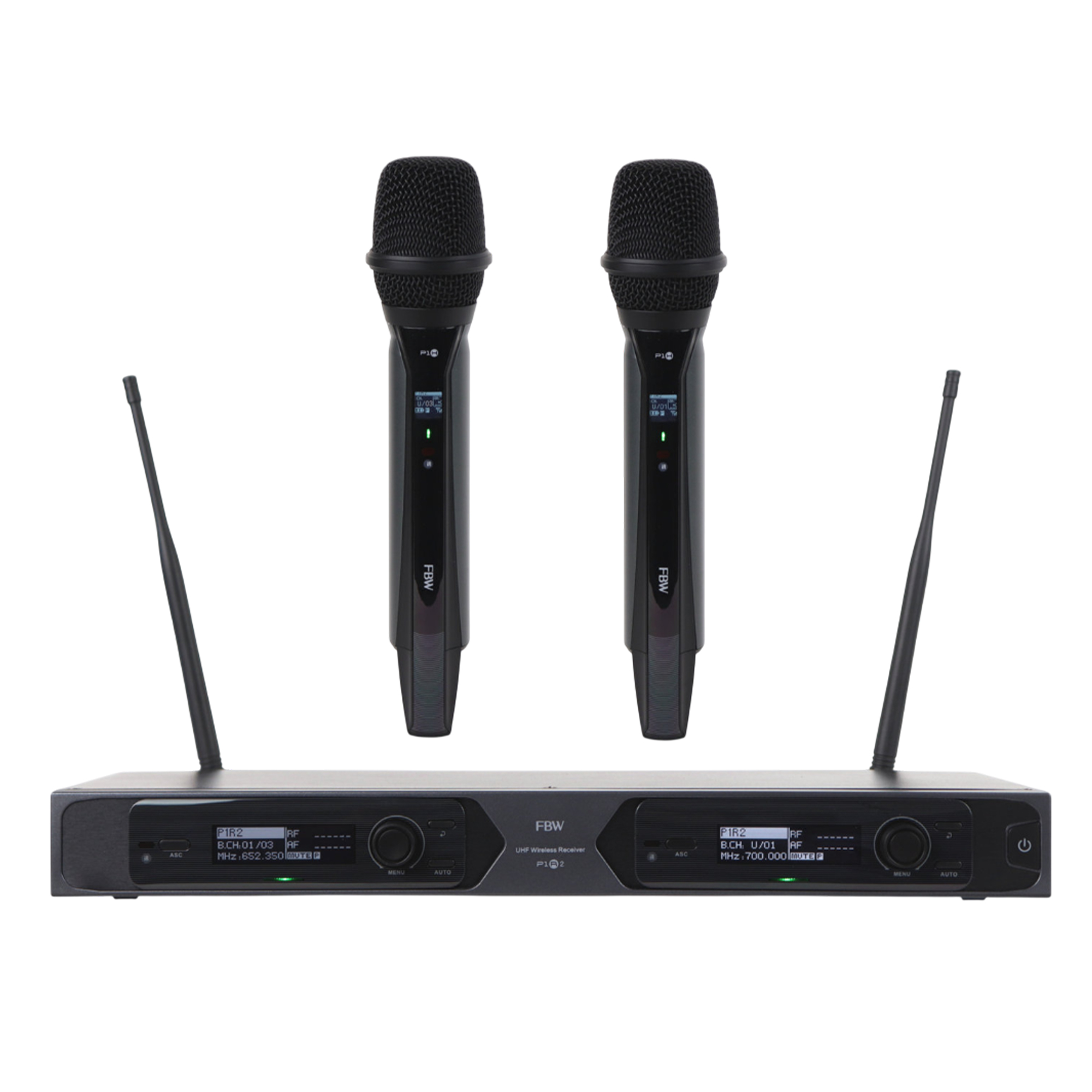 Двухканальный радиоприёмник FBW P1R2 является базовым устройством при построении микрофонных радиосистем различного назначения. Работает с радиопередатчиками компании FBW (P1B и P1H) или иных производителей, при условии обмена данными на тех же несущих радиочастотах (UHF диапазон 651МГц - 700МГц, задается до 1680 частотных каналов) и возможности синхронизации приемника с передатчиком посредством ИК-порта. Тип модуляции принимаемого от радиопередатчика акустического сигнала - FM (частотная).