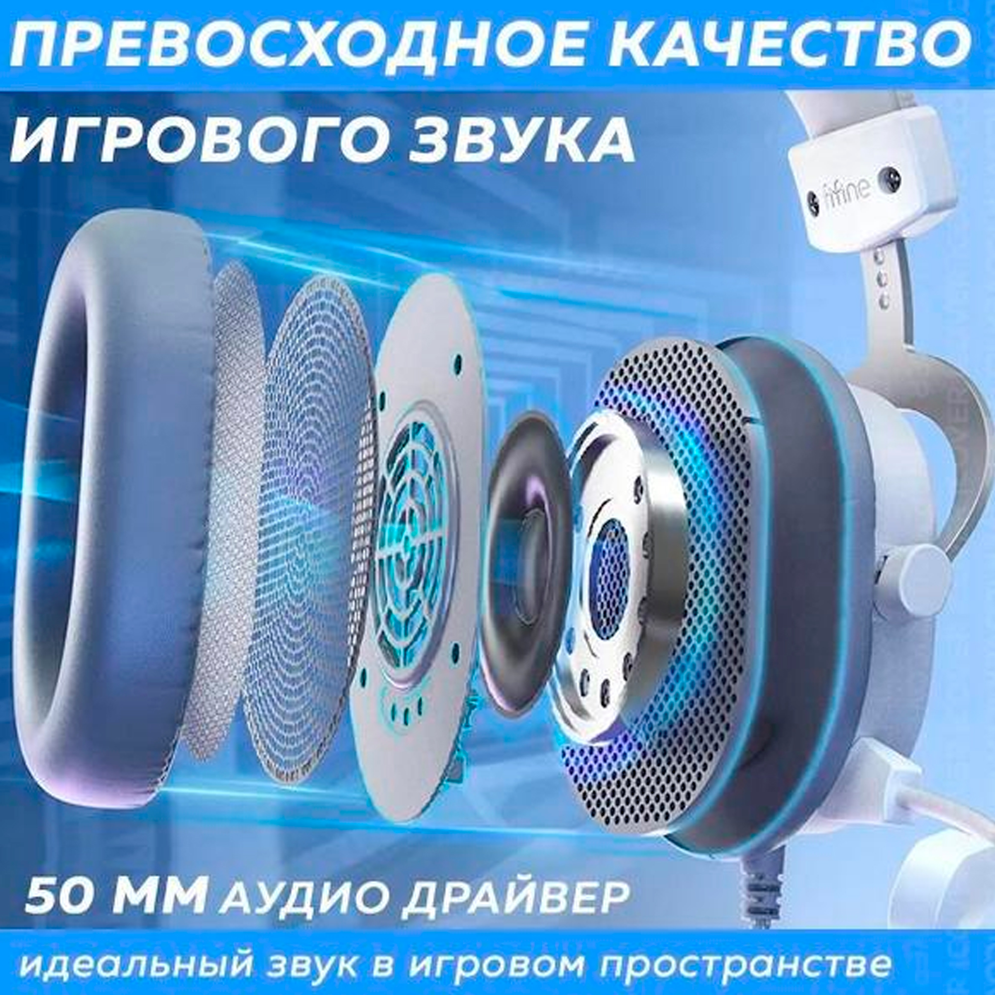 • гарнитура с динамиками диаметром 50 мм создает объемное звучание 7.1