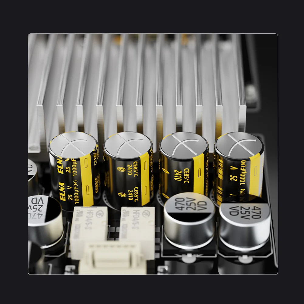 Два источника постоянного/переменного тока. Внутренний источник питания мощностью 30 Вт экранирован для снижения помех, в то время как внешний вход постоянного тока позволяет экспериментировать с линейными источниками питания более высокого класса. 18 малошумящих регуляторов питания LDO и 5 DC-DC преобразователей обеспечивают бесперебойное питание каждой секции. Конденсаторы аудиофильского класса: электролитические элементы ELNA RA3 с шелковой пленкой и специальные танталовые колпачки обеспечивают тепло и стабильность.