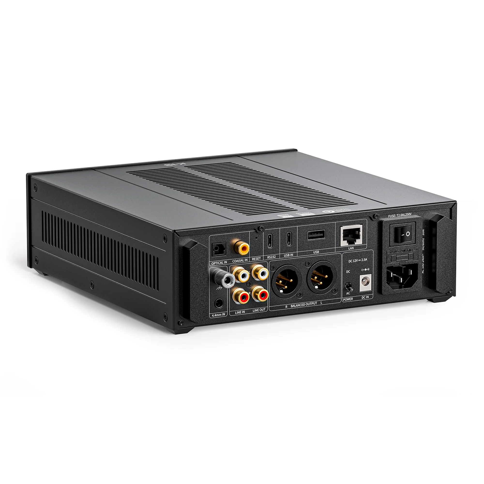Беспроводные возможности представлены современным Bluetooth с поддержкой высококачественных кодеков LDAC и aptX HD, а также сетевым модулем с dual-band Wi-Fi (2.4/5 ГГц) и портом Ethernet. Девайс полностью интегрирован в экосистемы Apple AirPlay 2 и Roon Ready. Через фирменное приложение FiiO Control пользователю доступна тонкая настройка звука, включая 10-полосный параметрический эквалайзер.