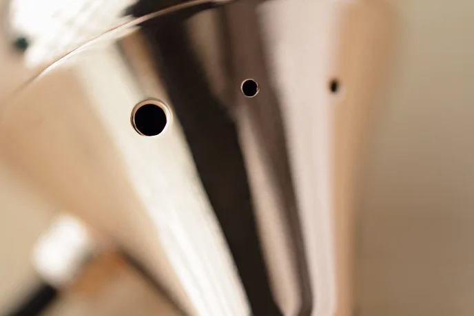 Суживающаяся тыльная сторона корпуса имеет несколько микроотверстий, размер и местоположение которых определялось методом компьютерного моделирования, а также с помощью дополнительных субъективных тестов.