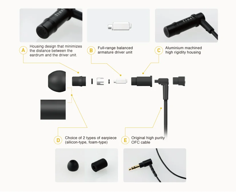Возможность расположения драйвера наушника значительно глубже в ушном канале позволяет добиться более реалистичного звучания невероятно высокого качества. Для этого мы существенно уменьшили корпус наушников F3100, сократив при этом и количество составляющих конструкцию элементов. Диаметр корпусов составляет 5,5 мм, они выполнены из алюминиево-магниевого сплава и имеют анодированное покрытие, что также позволило снизить их вес. Уникальный способ разработчиков Final использовать полнодиапазонные балансные арматурные драйверы во всех моделях обеспечивает потрясающее наполнение звука басами, неожиданное для наушников такого размера. Наушники оборудованы заушным крючком, способствующим сокращению микрофонного эффекта кабеля.