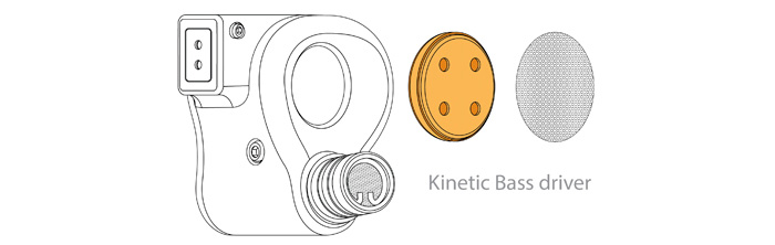 Технология Kinetic Bass реализована открытым 10-миллиметровым динамическим драйвером, который встроен во внешнюю часть корпуса IEM. Динамик соприкасается хрящом ушной раковины, благодаря чему низкие частоты звука преобразуются в кинетическую энергию и достигают внутреннего уха через костную проводимость. В результате этого бас приобретает необычное дополнительное расширение и массу.