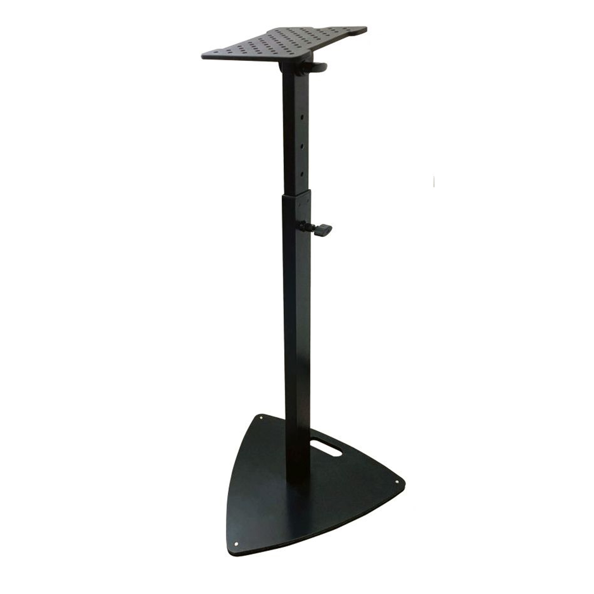 Стойки выполнены из прочной стали и имеют треугольное основание размером 430 x 403 мм, что гарантирует устойчивость на различных типах напольных покрытий. Верхняя площадка имеет габариты 220 x 180 мм и оснащена специальным прорезиненным покрытием, которое предотвращает соскальзывание монитора и помогает минимизировать нежелательные вибрации.