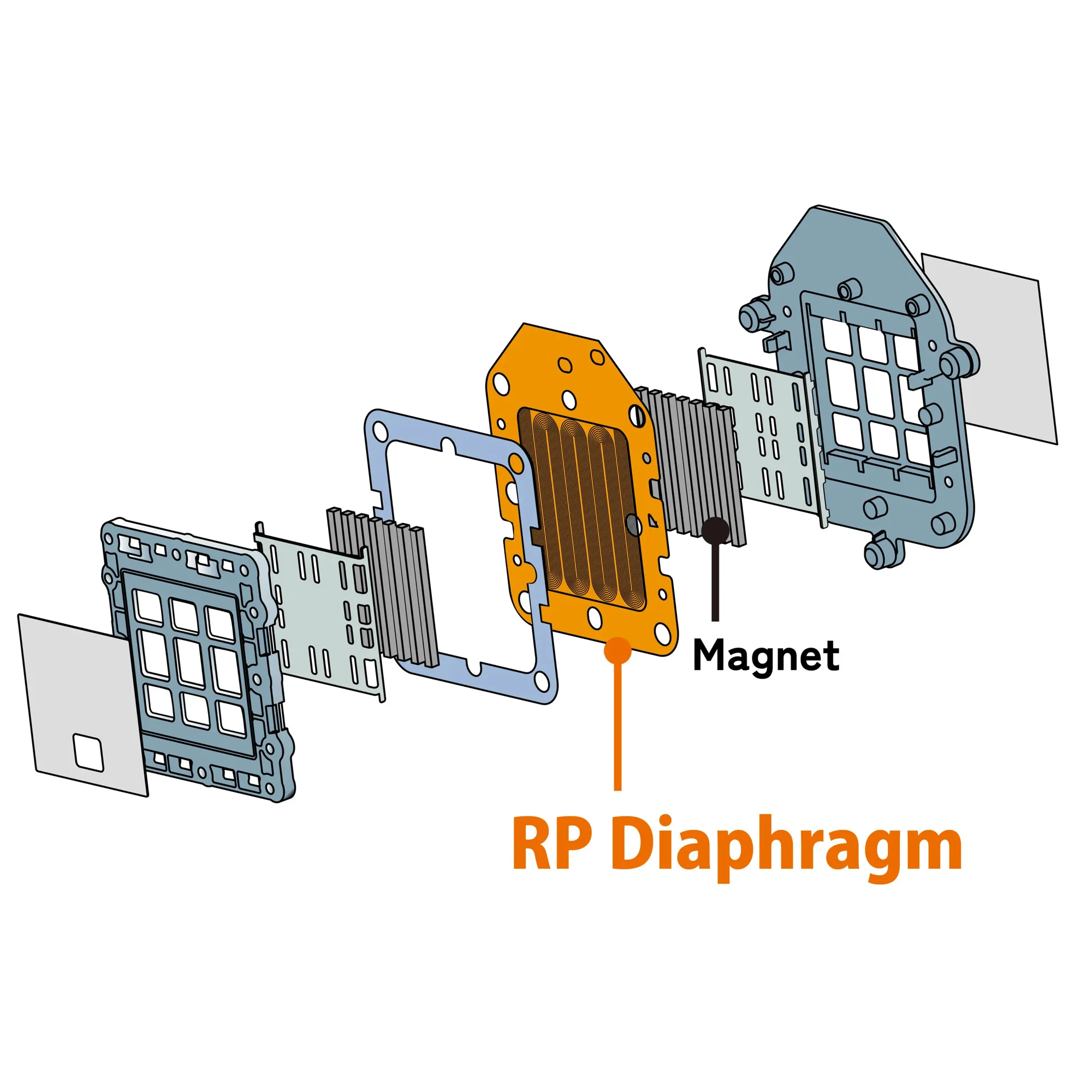 Планарный магнитный привод RP technology, впервые разработанный более 50 лет назад и постоянно совершенствуемый на протяжении многих лет, теперь представлен в четвертом поколении. Для расширения и выравнивания зоны вибрации плоской диафрагмы была использована новая форма печатной катушки. Кроме того, было значительно увеличено количество магнитов, которые соединяют мембрану. Кроме того, компоненты магнитной цепи были переработаны для оптимизации распределения магнитного потока, подавления ненужного резонанса и достижения еще лучшей переходной характеристики.