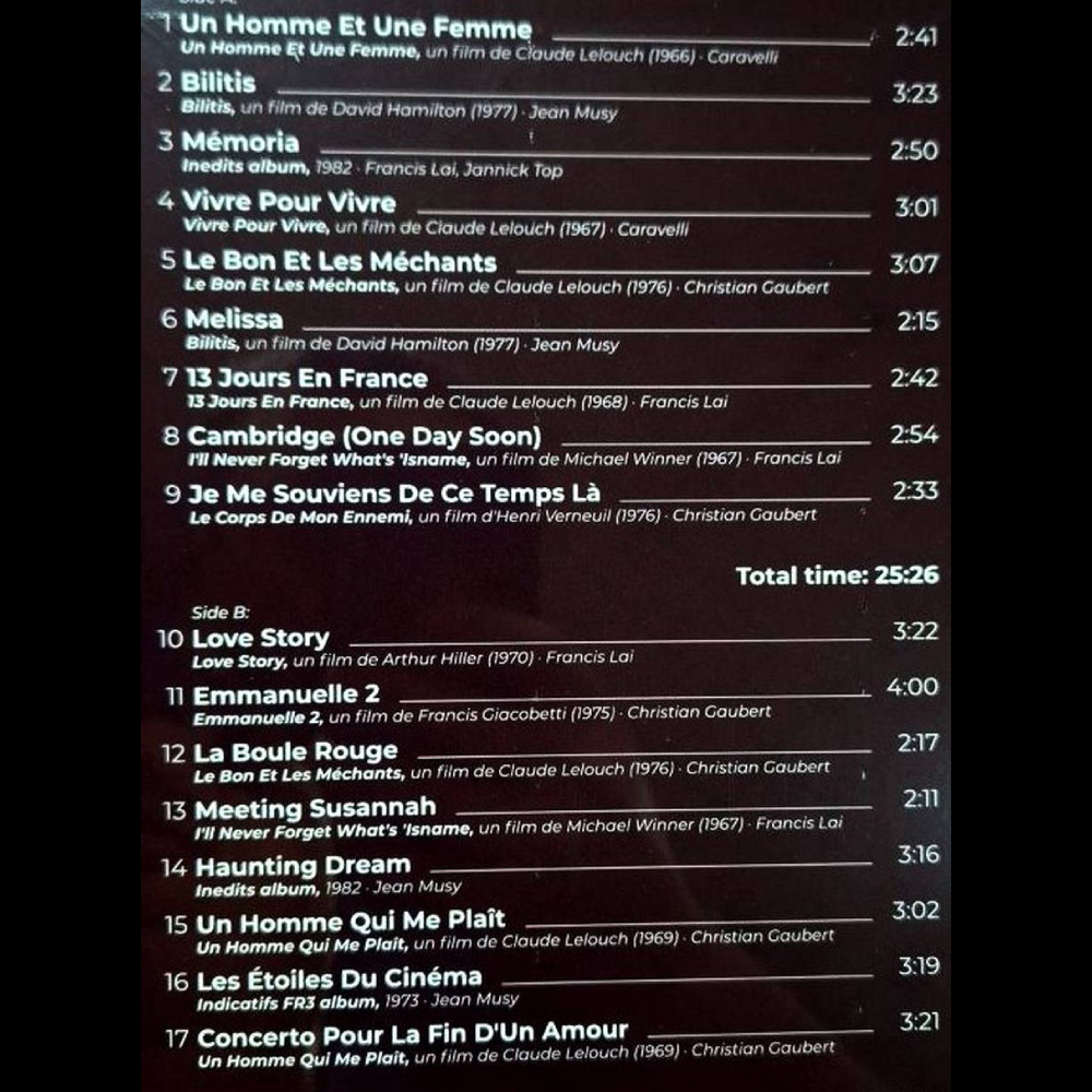 Интересный факт: тема «Love Story» в начале 1970-х годов стала одной из самых узнаваемых мелодий в мире, а композиция «Un Homme Et Une Femme» считается музыкальным символом французского кинематографа. Многолетнее сотрудничество Франсиса Ле с режиссёром Claude Lelouch подарило миру десятки шедевров, многие из которых представлены на этой пластинке.