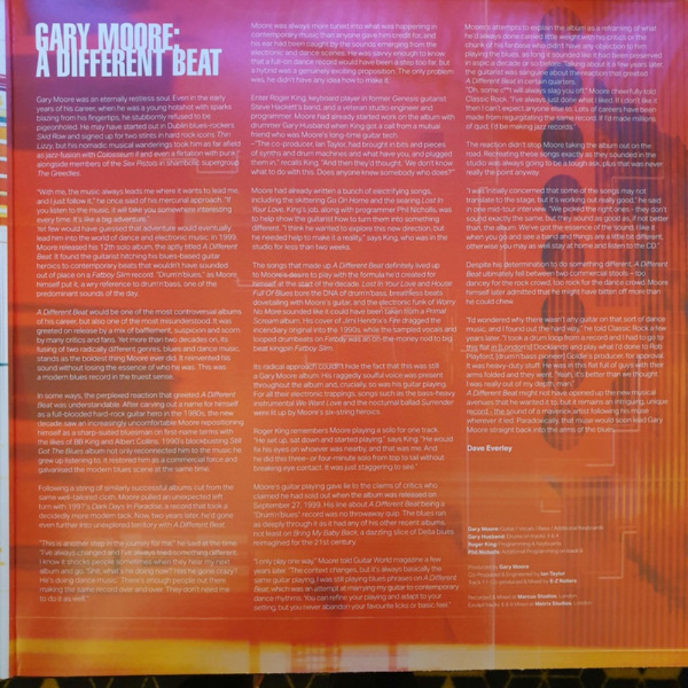 В отличие от привычных блюзовых и хард-роковых работ, A Different Beat — это дерзкий шаг в мир электронных и танцевальных ритмов. Гитарист сочетает узнаваемые фирменные соло с современными элементами: лупами, сэмплами, клавишными текстурами и даже влиянием драм-н-бэйса. Этот альбом стал своего рода музыкальной лабораторией, где Мур, не боясь критики, исследовал границы звука и формы.