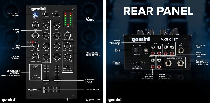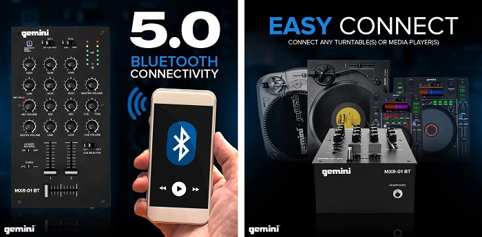 Важной особенностью Gemini MXR-01BT является возможность воспроизведения аудио со смартфона или планшета подключенных к микшеру по Bluetooth.