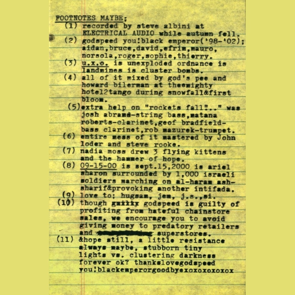 Впервые выпущенный в 2002 году и ставший одним из самых дискуссионных релизов коллектива, альбом вобрал в себя фирменное звучание канадской группы: протяжные инструментальные партии, тревожные атмосферные переходы и мощные звуковые взрывы. Музыка на этой пластинке напоминает кинематографический саундтрек, в котором нет слов, но каждая нота наполнена эмоциями и внутренним напряжением.
