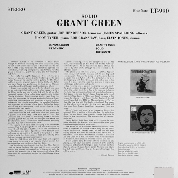 Этот альбом яркое свидетельство редкого и мощного звучания Grant Green в формате пост‑бопа смелое, динамичное и глубокое одновременно. В июне 1964 года Green собрал по‑настоящему «звёздный» состав: вместе с ним в студии оказались Joe Henderson и James Spaulding (дуэт саксофонов), виртуоз за фортепиано McCoy Tyner, надёжный ритм‑секшен в лице Bob Cranshaw и Elvin Jones именно таким составом Green редко отдавался чистому хард‑бопу. Запись была сделана для лейбла Blue Note Records, но по тем временам лейбл предпочитал выпускать более «доступные», в смысле соул‑джаза, работы Green’а, поэтому «Solid» пролежал на полке до 1979 года.