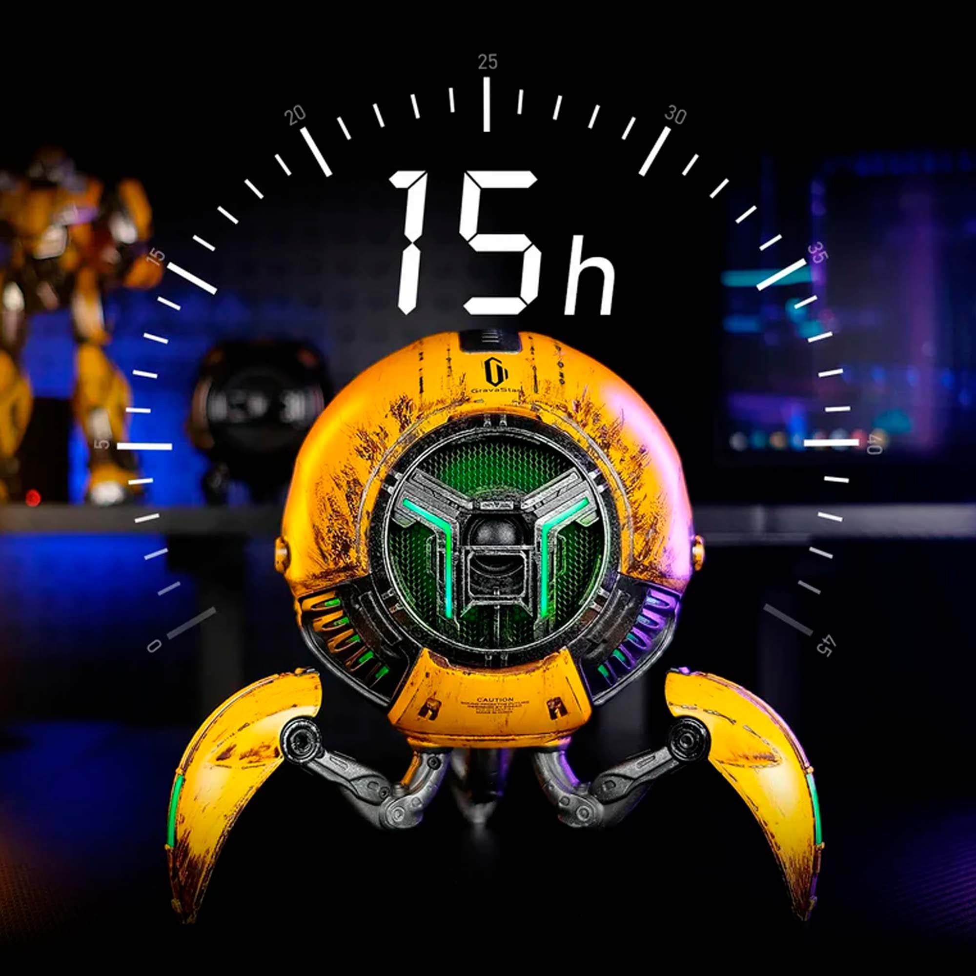 Gravastar Mars Pro Black V2 - двухполосная Bluetooth аудиосистема с дополнительным пассивным низкочастотным излучателем. Его футуристический дизайн в стиле «меха» привлекает внимание, а динамик впечатляет слух. Три складные ножки приподнимают прочную оболочку из цинкового сплава, обеспечивая чистый звук без искажений от контакта с поверхностью.