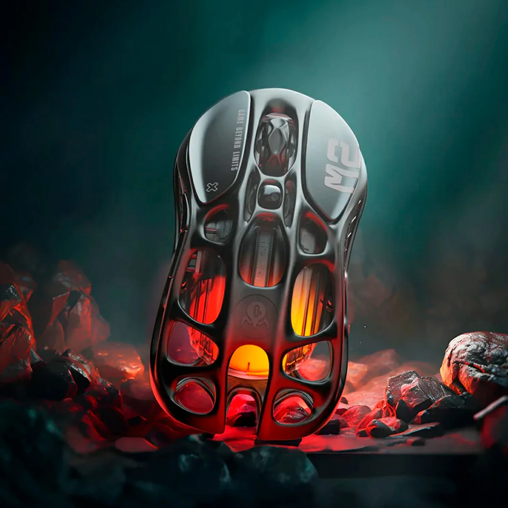 Корпус выполнен из цинк-алюминиевого сплава, что придаёт мыши премиальное ощущение и повышенную прочность при весе всего ≈75 г. Структурная геометрия корпуса напоминает роботизированные элементы — с открытым «каркасным» дизайном, подсветкой и точными линиями.