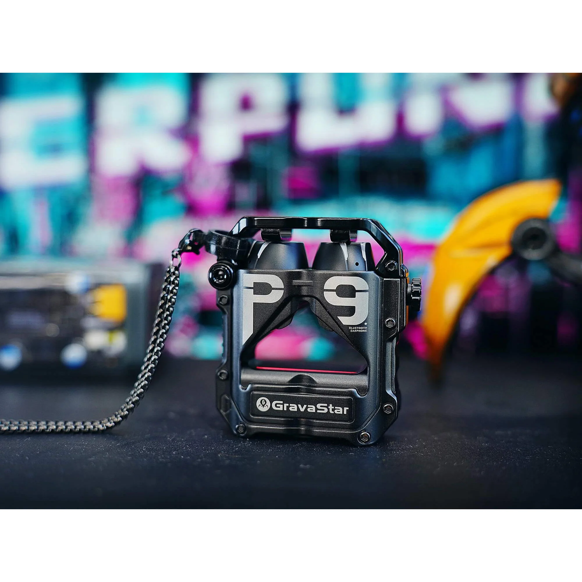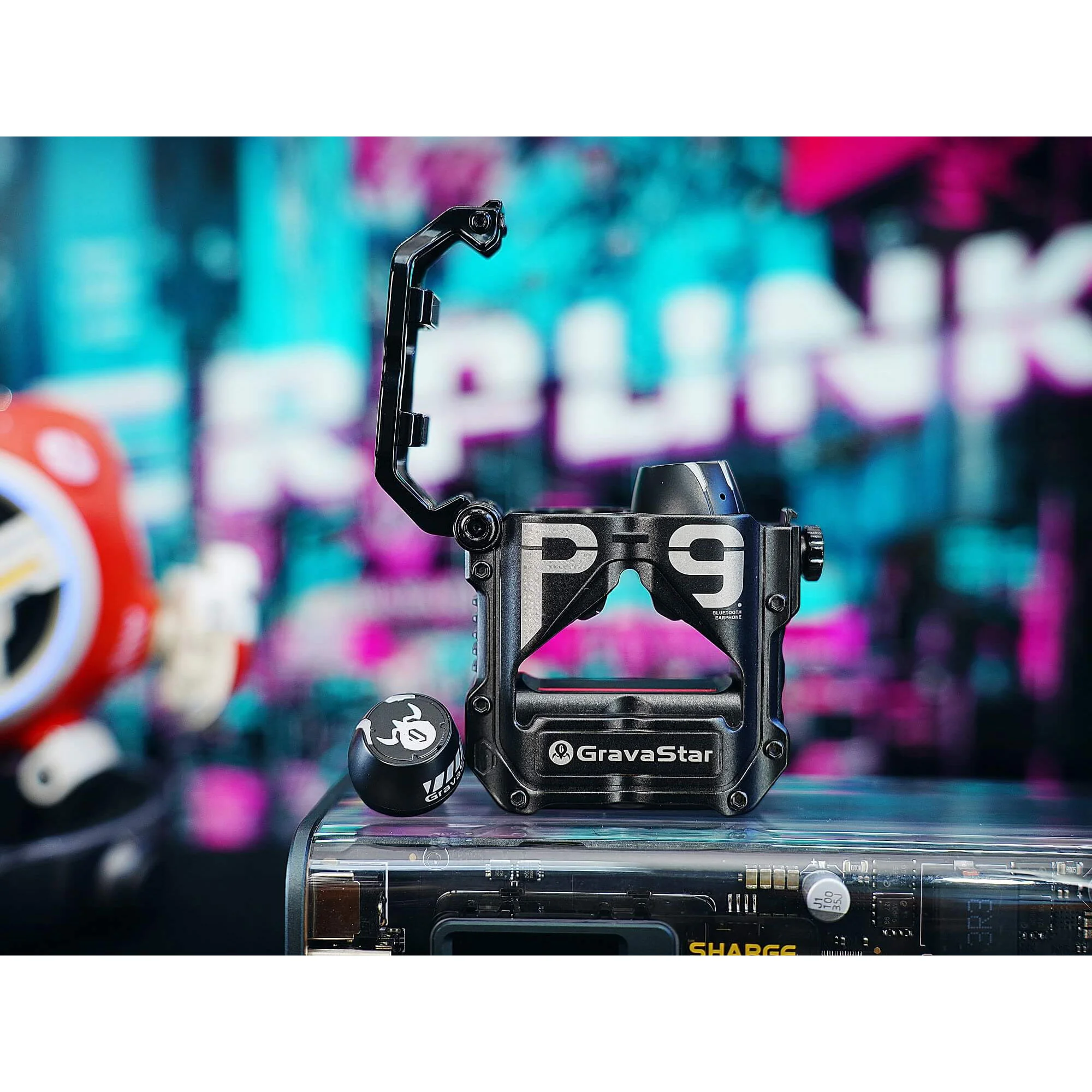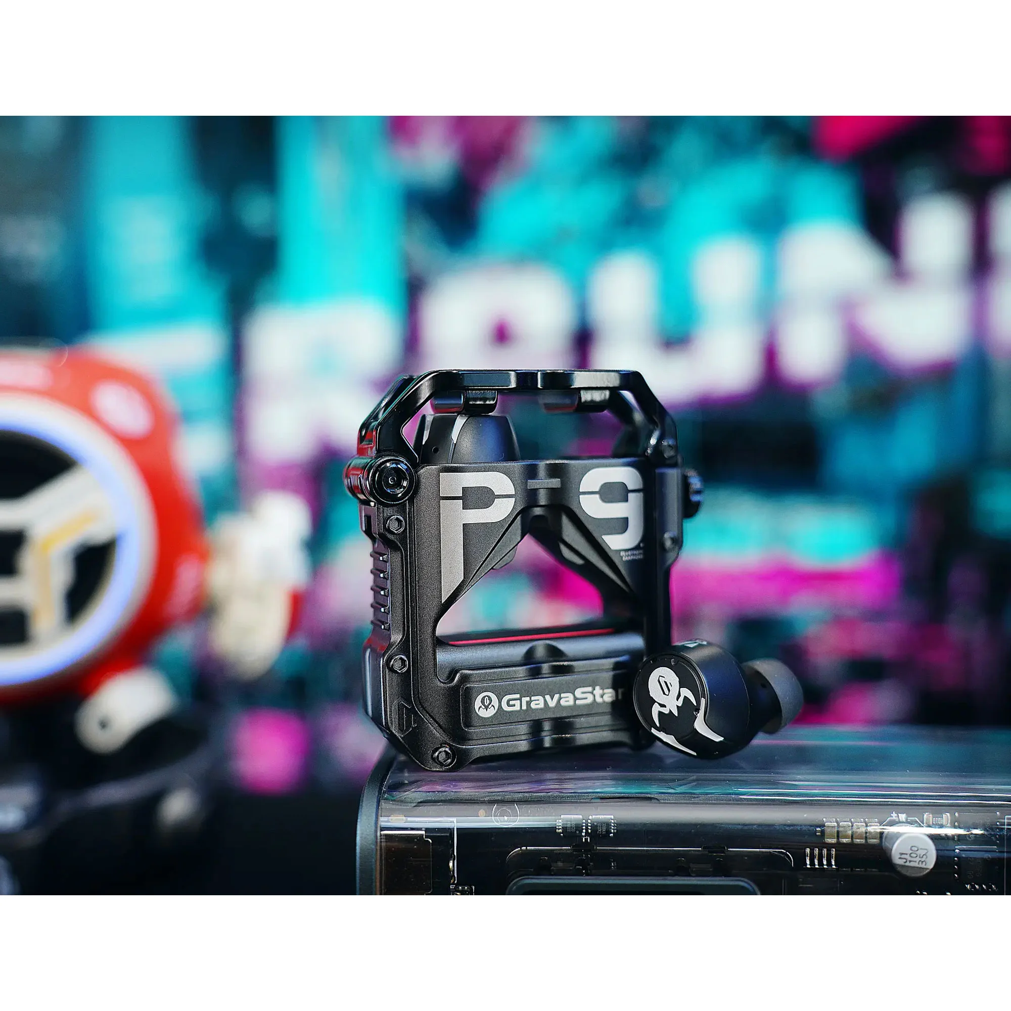 Корпус зарядного кейса выполнен из цинкового сплава, устойчивого к царапинам. Механическая кнопка и лазерная гравировка придают корпусу и наушникам стильный футуристический облик.
